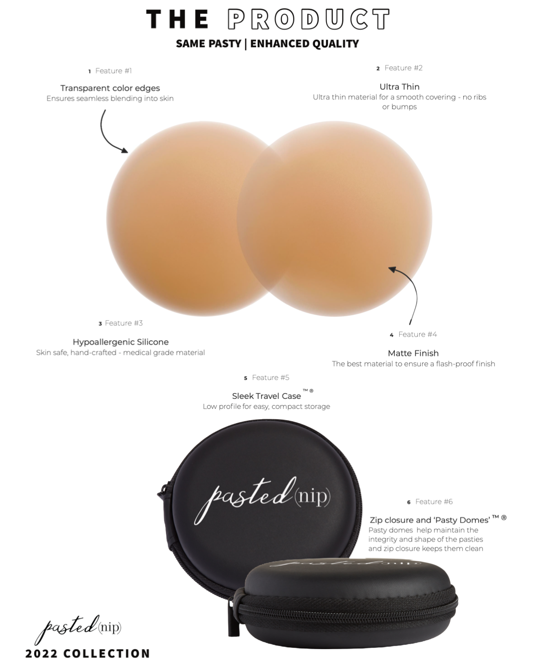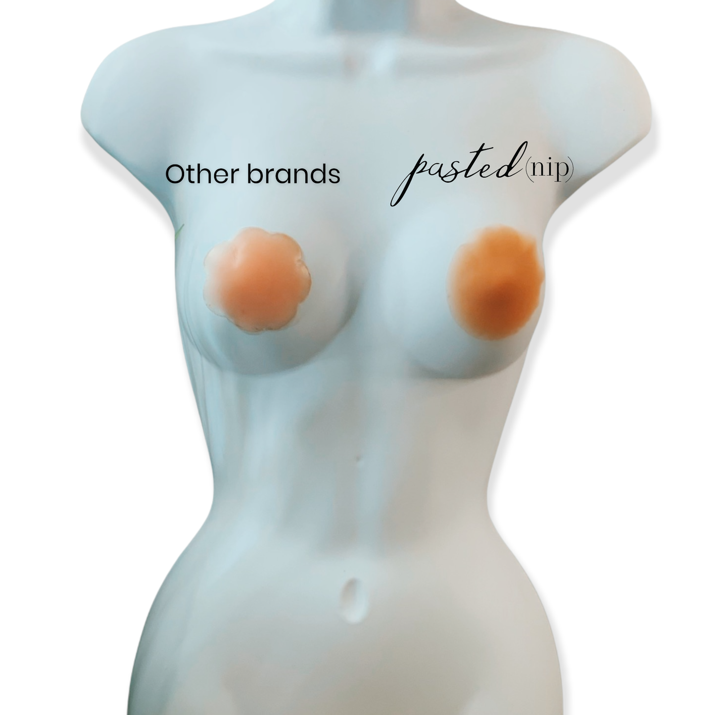 Pasted Nip is more than just a product, it's about empowerment for women. We're passionate about helping women feel confident and comfortable without the constraints of a bra. Hypoallergenic silicone | Skin safe, hand-crafted medical grade material is water-proof and sweat-proof. Patented technology | Featuring INVISITECH™ nipple hiding technology, ultra thin material for smooth covering. Inclusive shades | Featuring a semi-luminous finish to blend seamlessly into all skin tones.