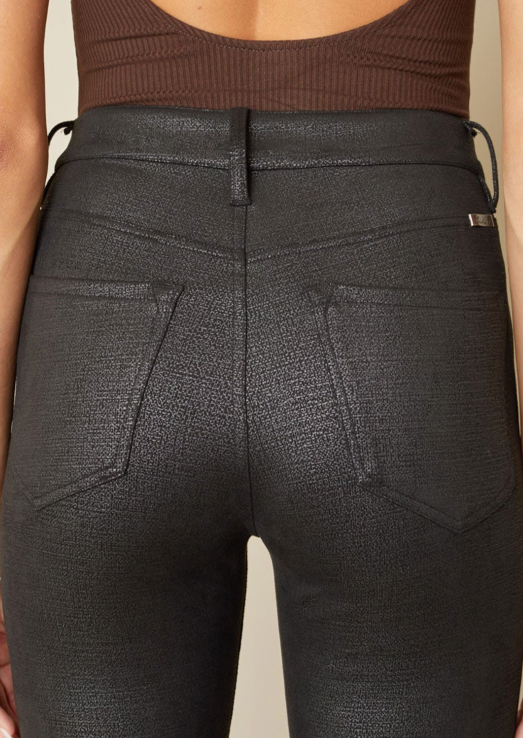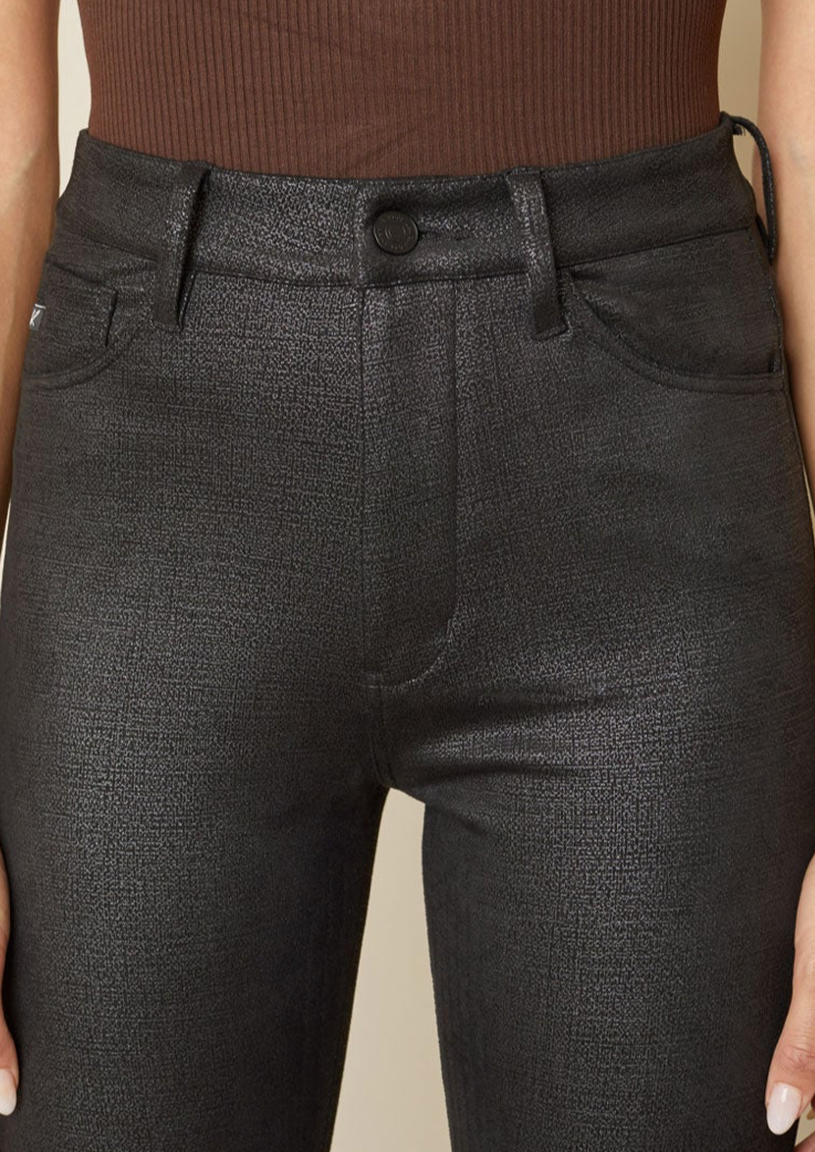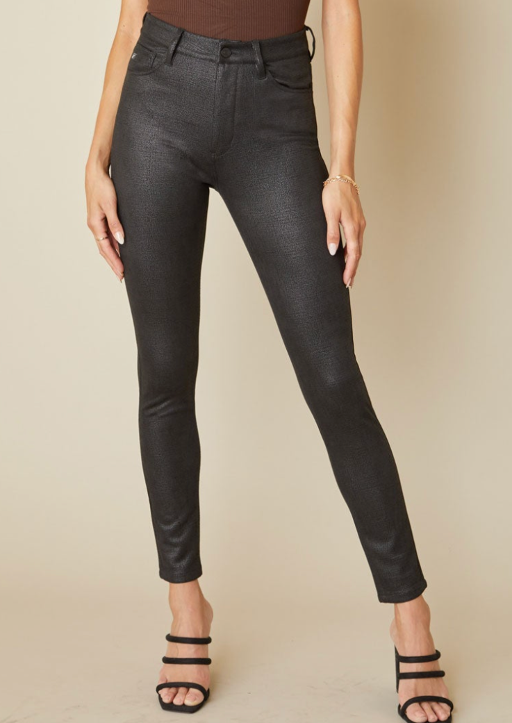 How cute is our Carla shiny black super skinny pant? Rock it with any of your favorite tops! Not only do they look amazing but are ever so comfortable. The Carla skinny pant features a sealed hem, 5-pocket design, and a single-button front with a zip fly closure.