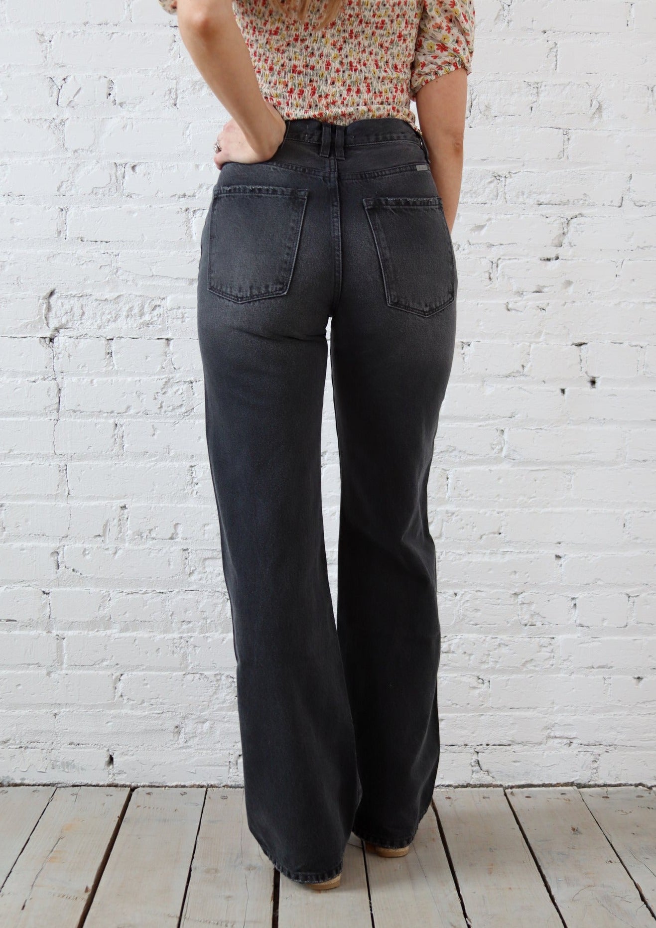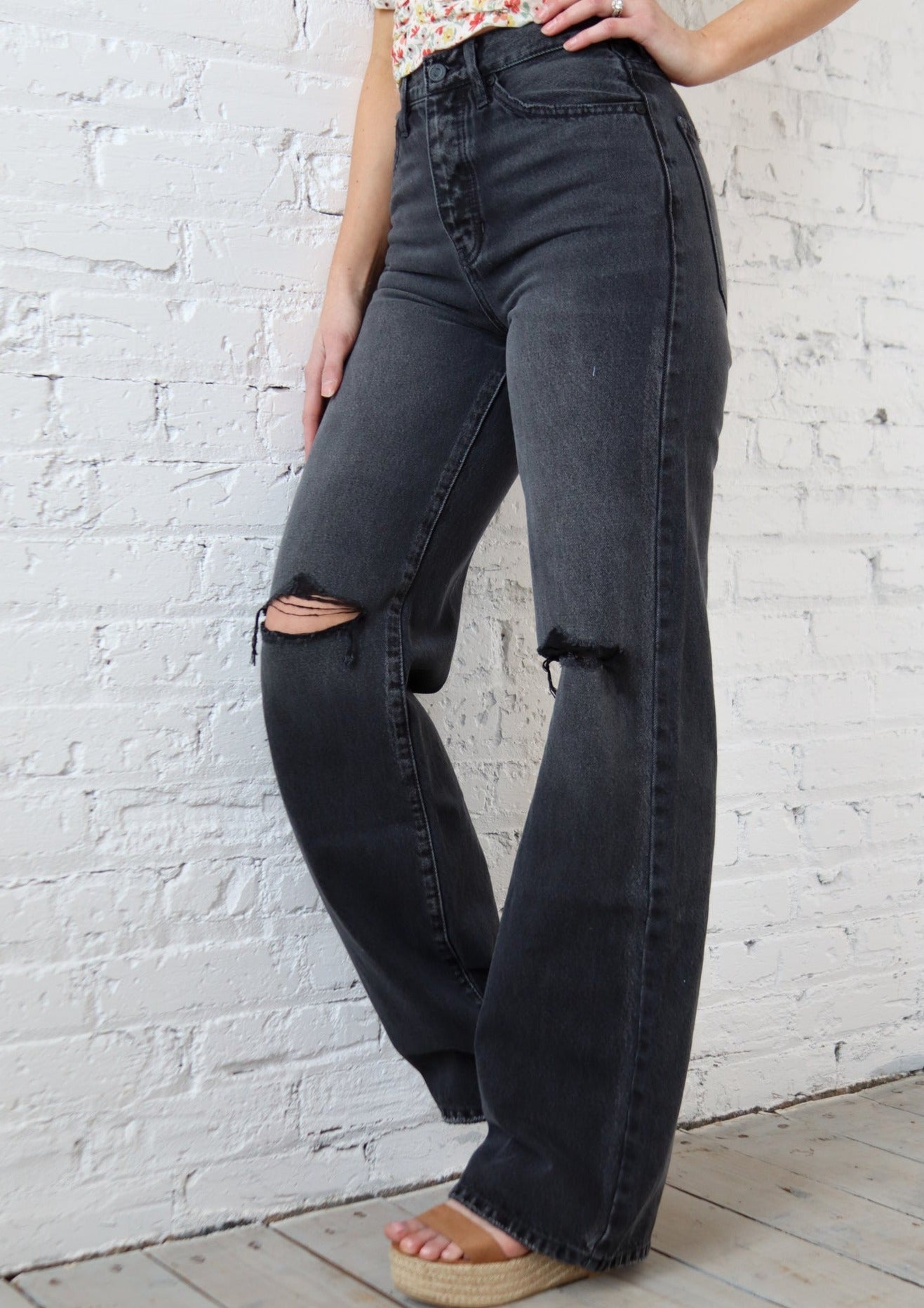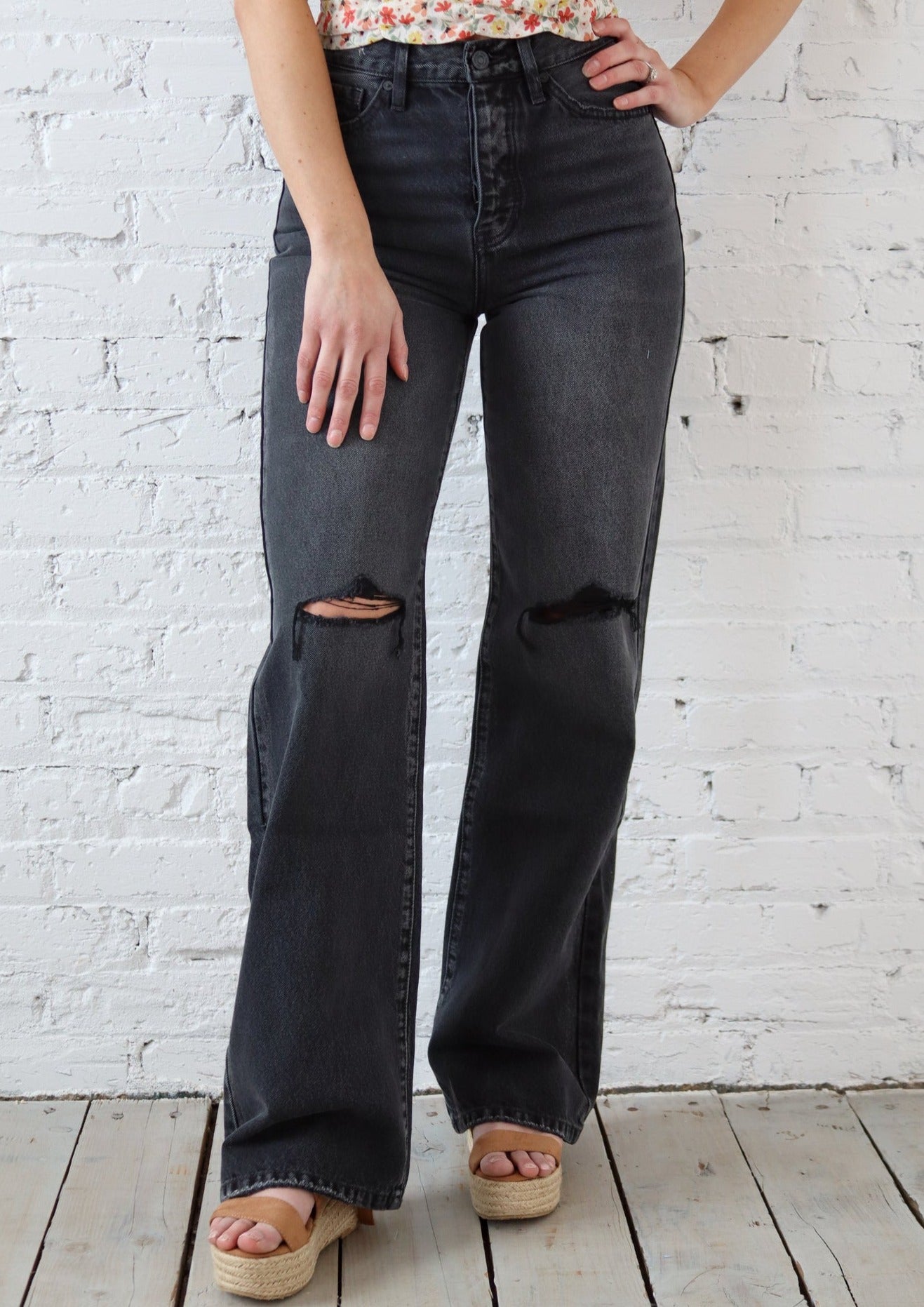 These are our newest high rise 90's flare and we are loving them! They have a hidden button fly, are distressed in the knees and have a regular hem line.