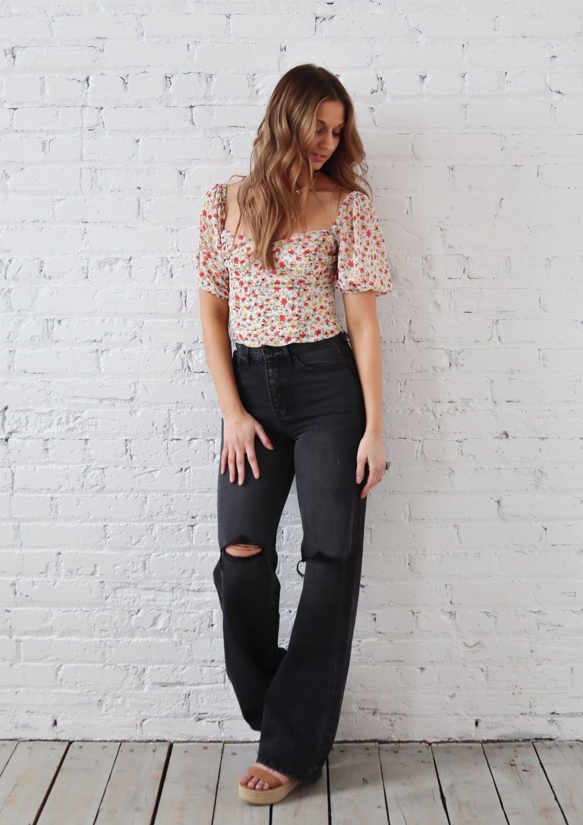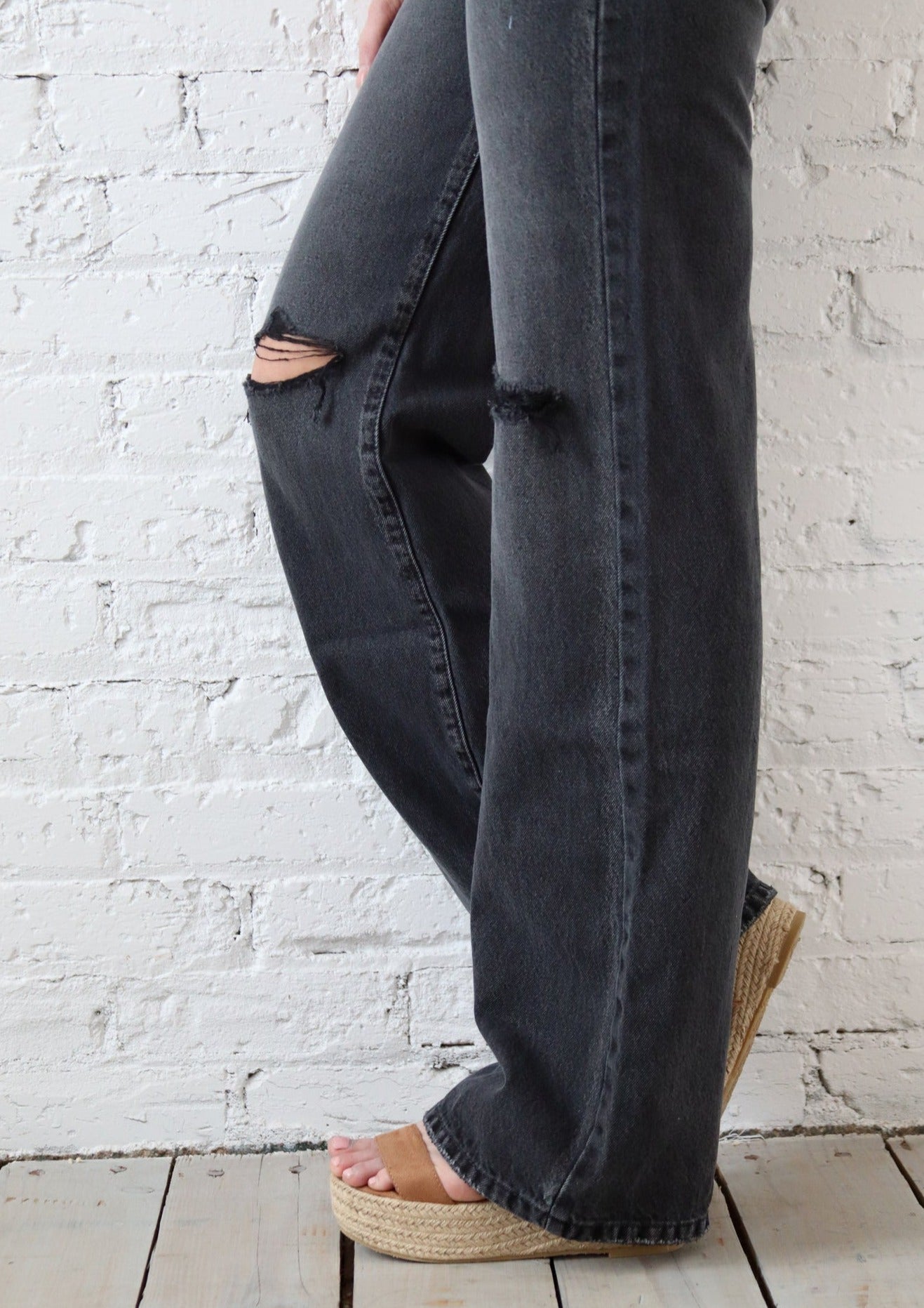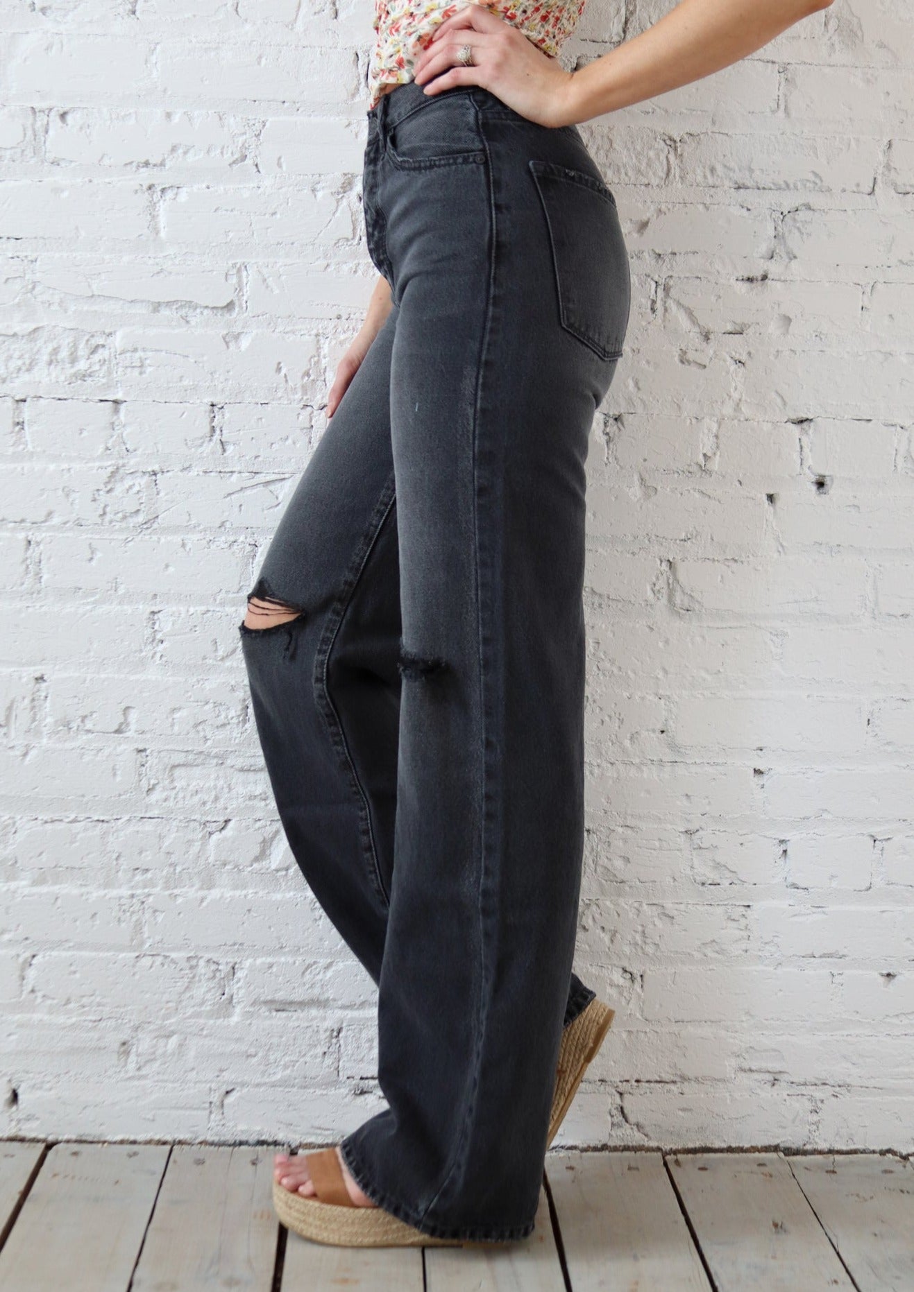 These are our newest high rise 90's flare and we are loving them! They have a hidden button fly, are distressed in the knees and have a regular hem line.