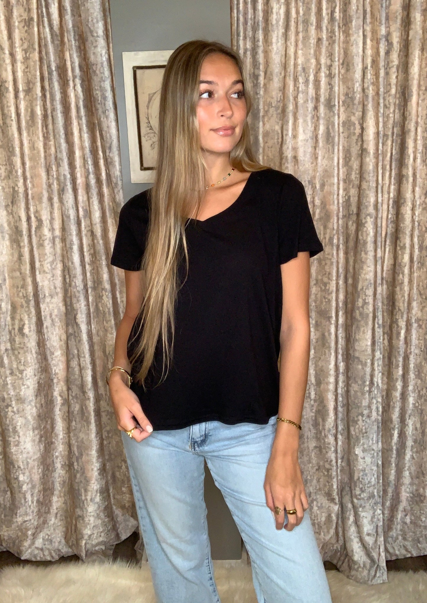 Made of light and airy Cotton, our favorite tee has an easy slouchy fit and a wide V-neck. Live-in-it soft and perfectly draped, it's one to stock up in every color.