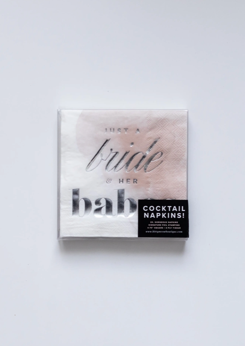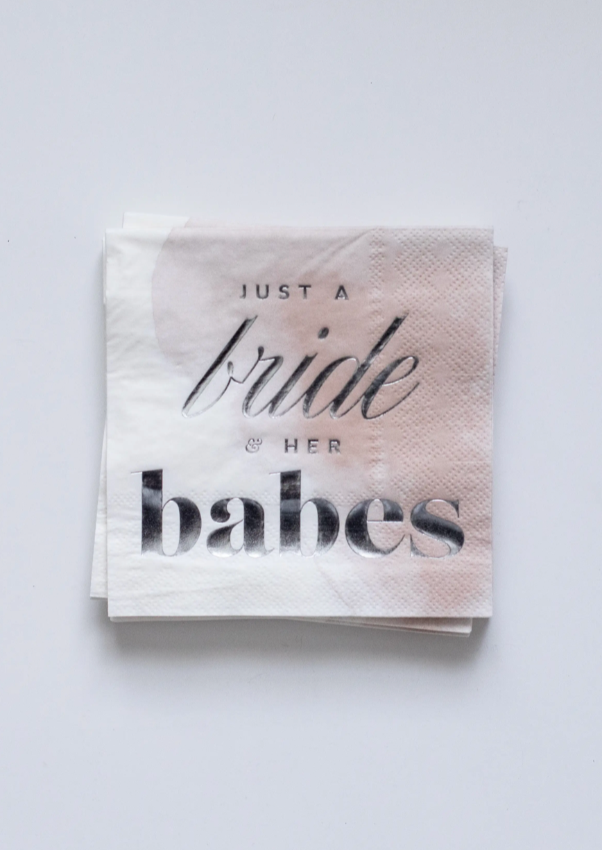 Product description: You deserve the best for your special occasion! Our "Just a Bride & Her Babes" Napkins are perfect for bridal showers, bachelorette parties, hostess gifts and more. These beautiful napkins feature 20 gorgeously designed cocktail napkins with blush watercolor and signature silver foil stamping. Each 5” square classic 3-ply tissue is packaged to perfection in a clear box, making it easy to get your party on! All of our products are handmade in the United States. Add these luxurious napkins to your event today and make it an unforgettable celebration!