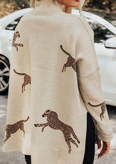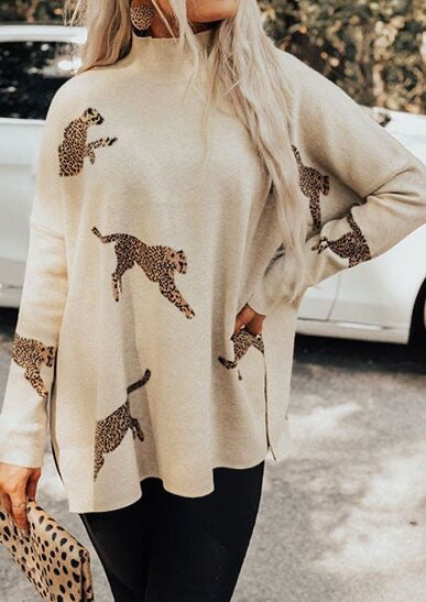 Animal Pattern Mock Neck Long Sleeve Slit Sweater