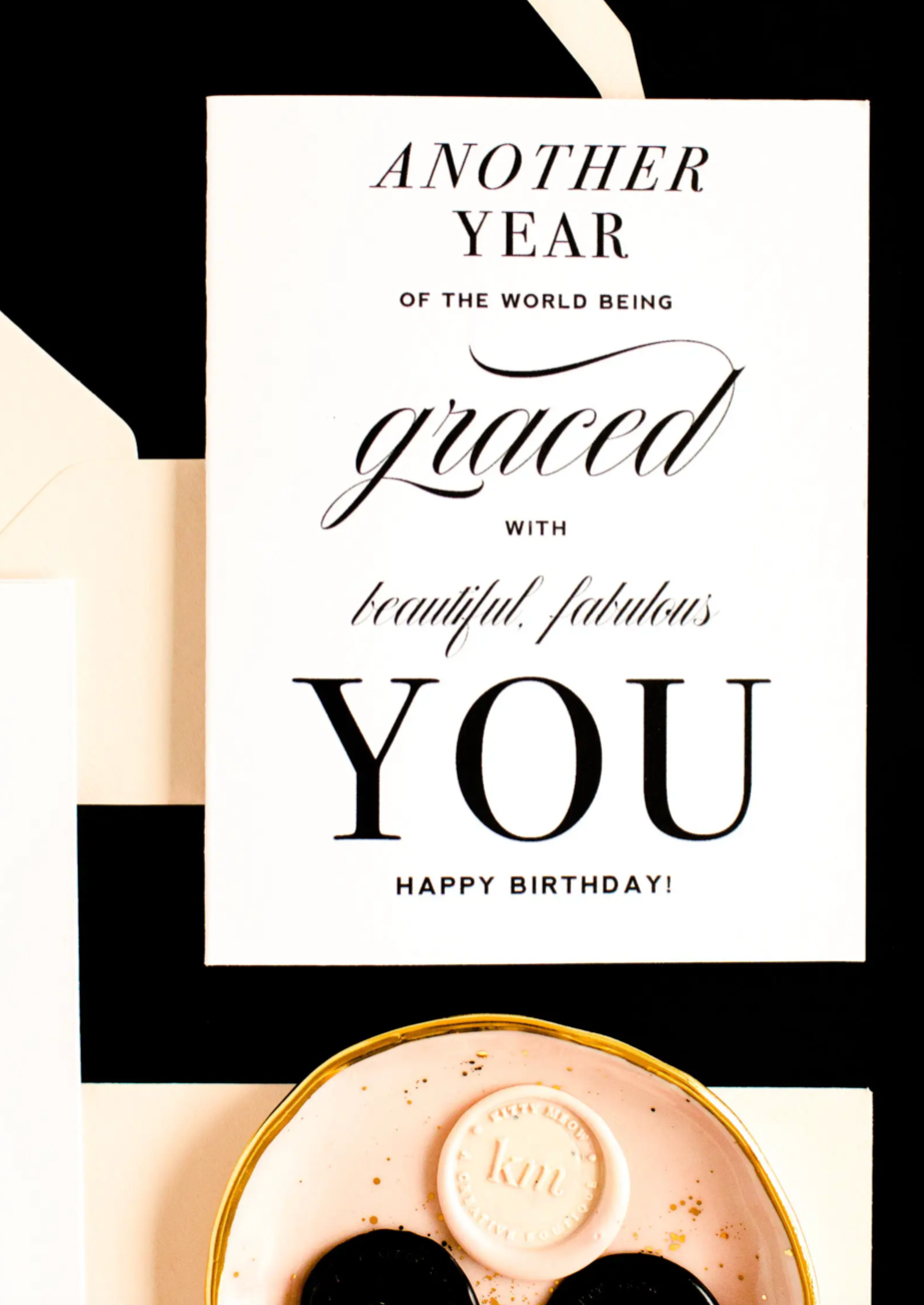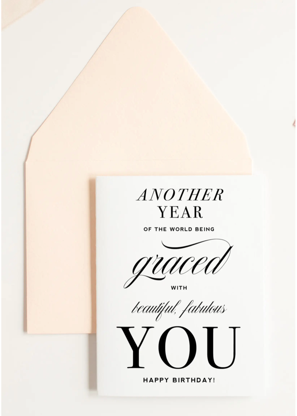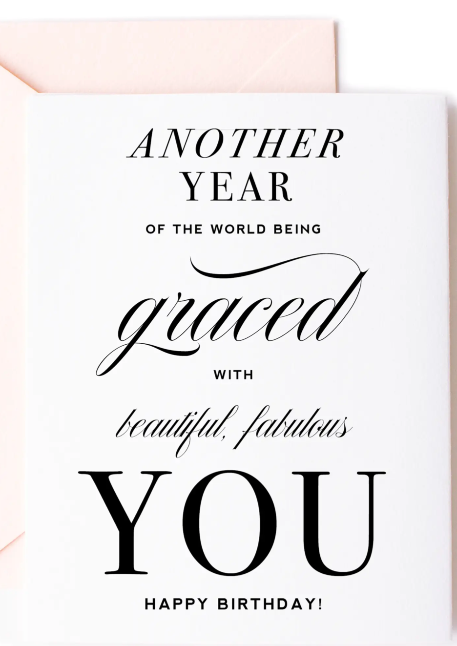 You deserve to celebrate your special day in style! Our "Another Year Graced" Birthday Card is the perfect way to show someone you care. This handmade card is printed on bright white, thick card stock and comes with a blush A2 envelope. The message inside reads "Another year of the world being graced with beautiful, fabulous YOU. Happy Birthday!" It's sure to make anyone feel appreciated and loved on their special day.