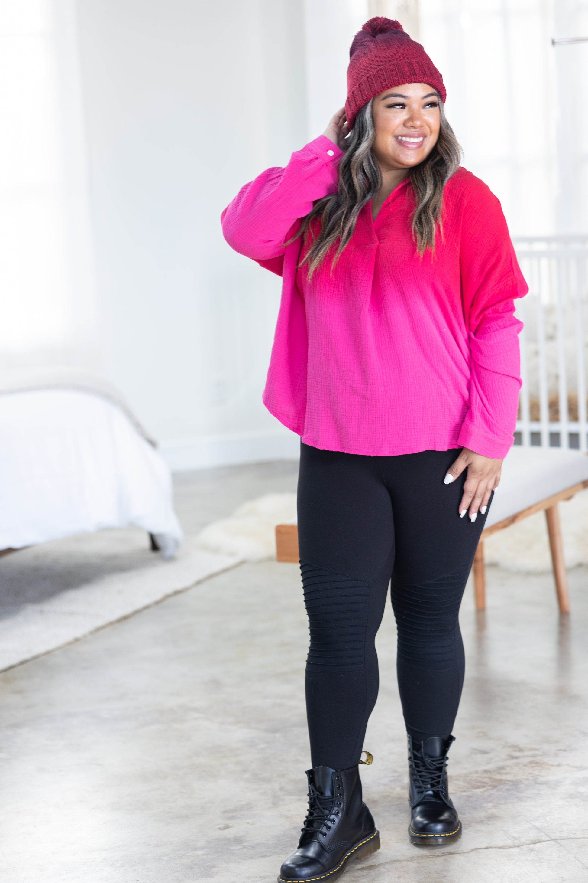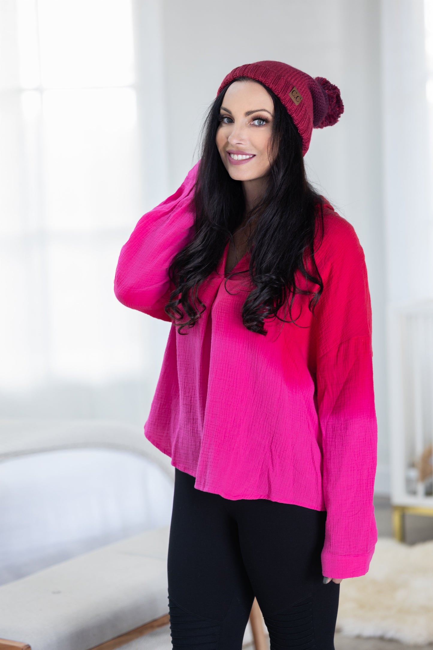 This long sleeve collared shirt is so incredibly soft, and that dipped ombre is to die for! With an oversized relaxed fit, this top features a collared notched neckline with a center front pleat, long sleeves with a button cuff and round hem.