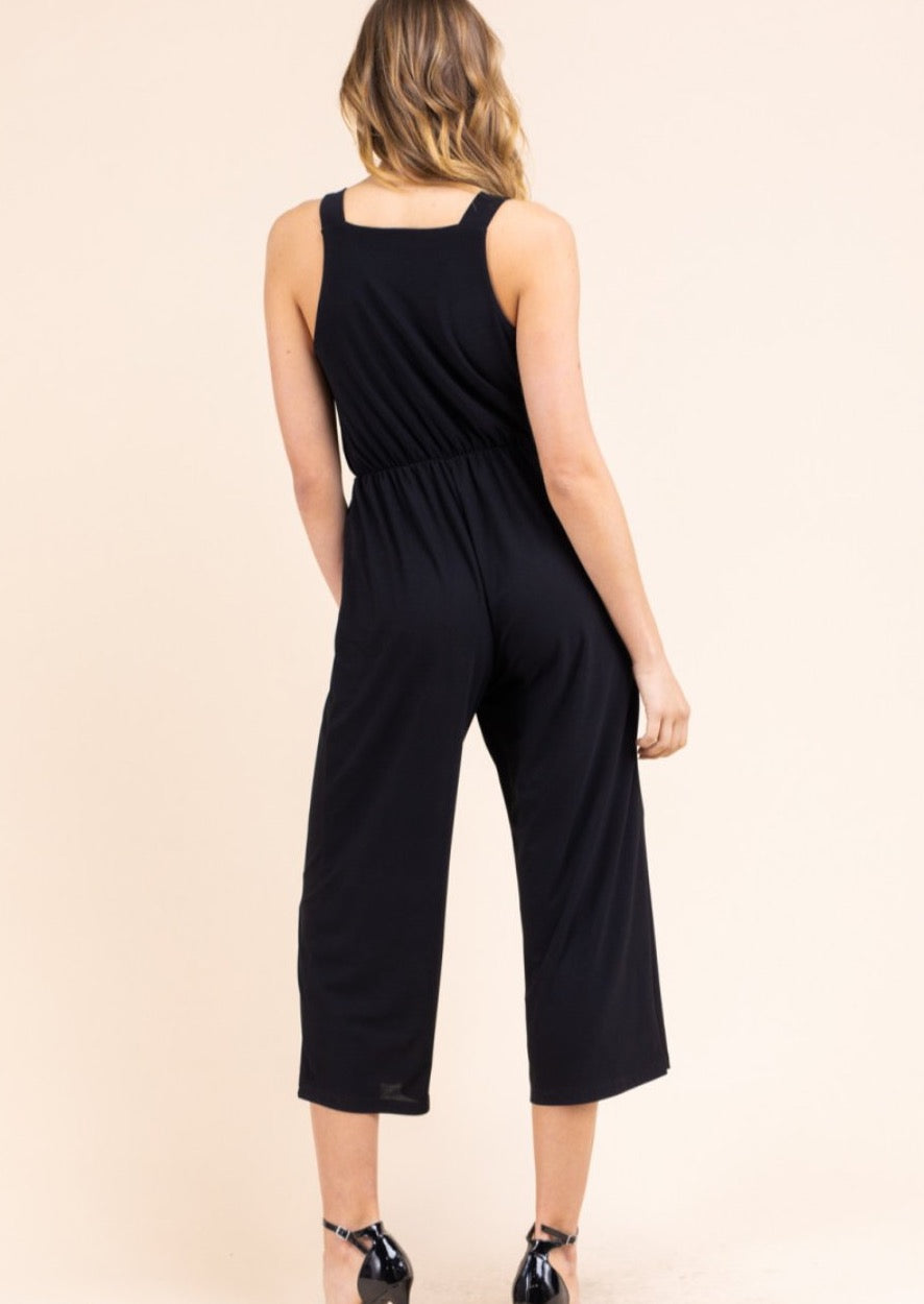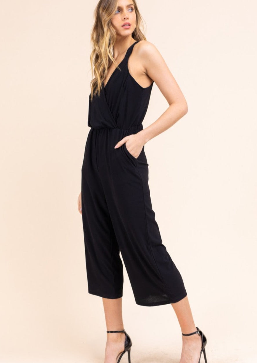 Relaxed Midi Jumpsuit with Cross Over Top, Elastic Waist & Pockets!