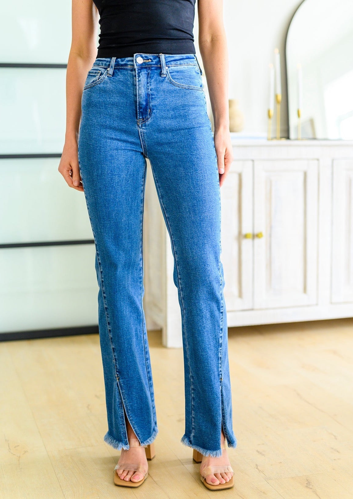 Introducing the Caitlin High Rise Split Hem Straight Jeans, our modern and stylish jeans with a vintage wash offering maximum comfort. Featuring a high rise, the relaxed straight cut design and front slits give a subtle bootcut flare ending in a raw hem. Look and feel amazing in these fashionable jeans!