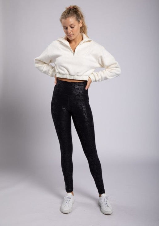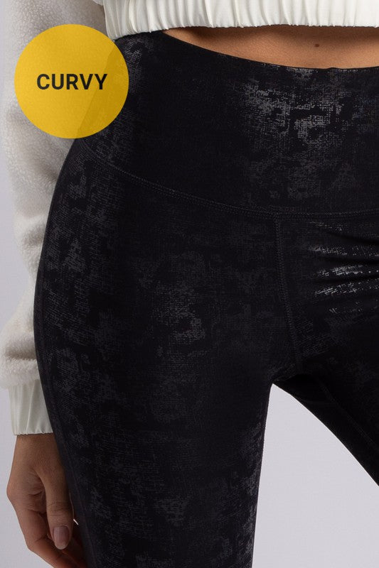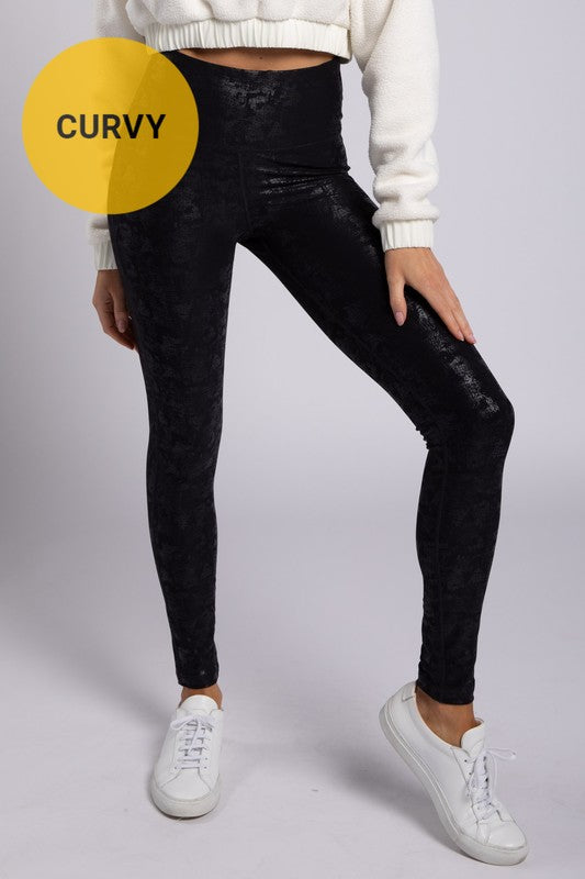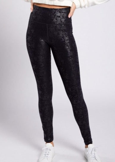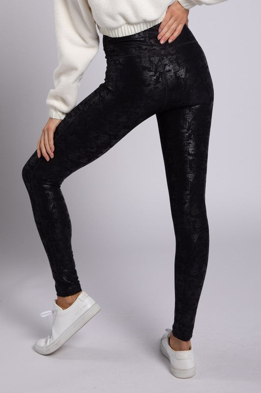 Answer: Upgrade your activewear with these Crackle Glaze Foil Highwaist Leggings! These leggings feature a unique foil print in crackle glaze for an eye-catching pattern. The discreet pouch on the waistband is perfect for keeping your phone close and hands-free. Plus, they offer tummy control, moisture-wicking fabric, and four-way stretch so you can move comfortably during any activity. With 85% polyester and 15% spandex construction, these leggings are sure to become a go-to favorite in your wardrobe. Get ready to look and feel amazing with these Crackle Glaze Foil Highwaist Leggings!