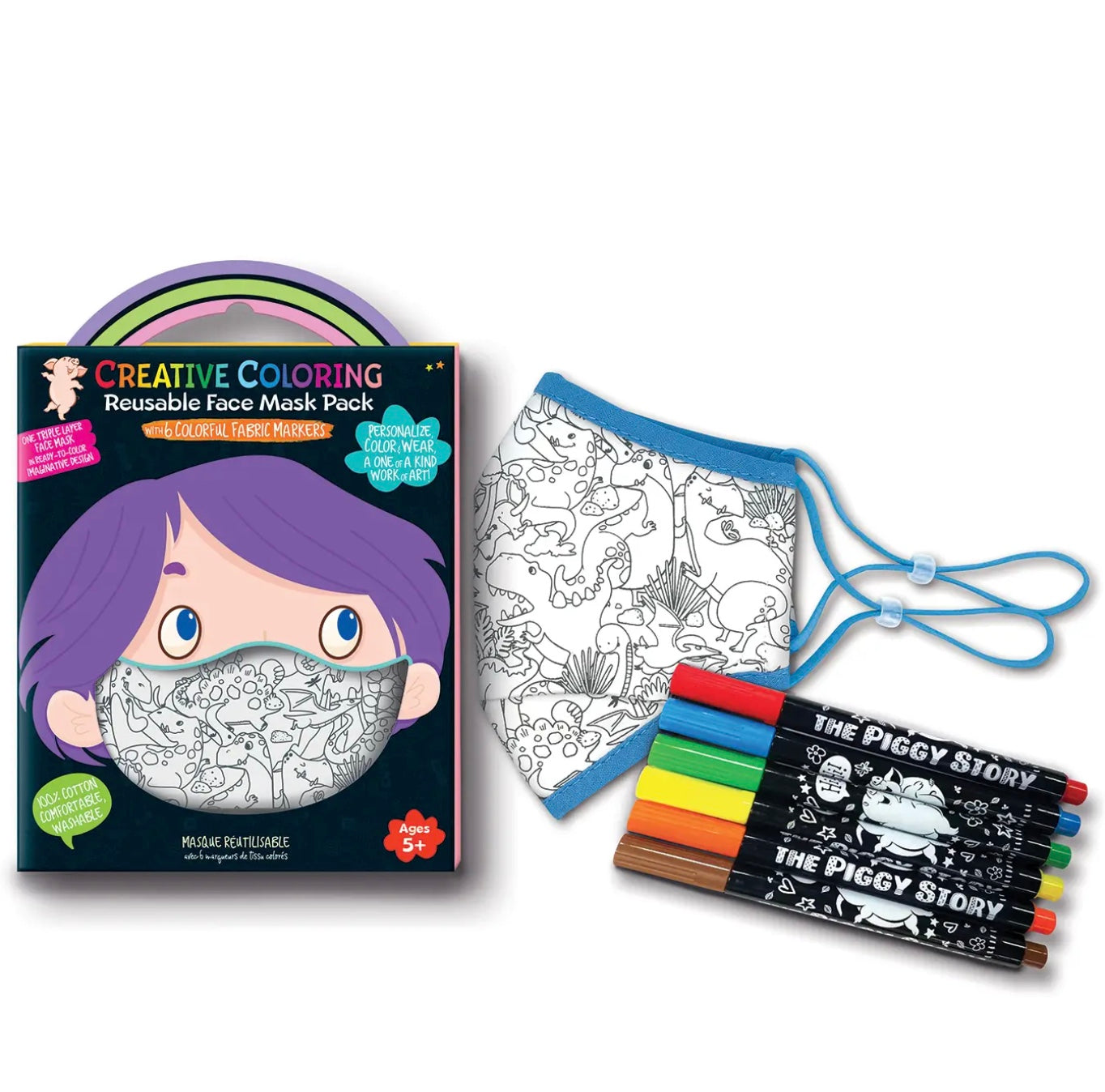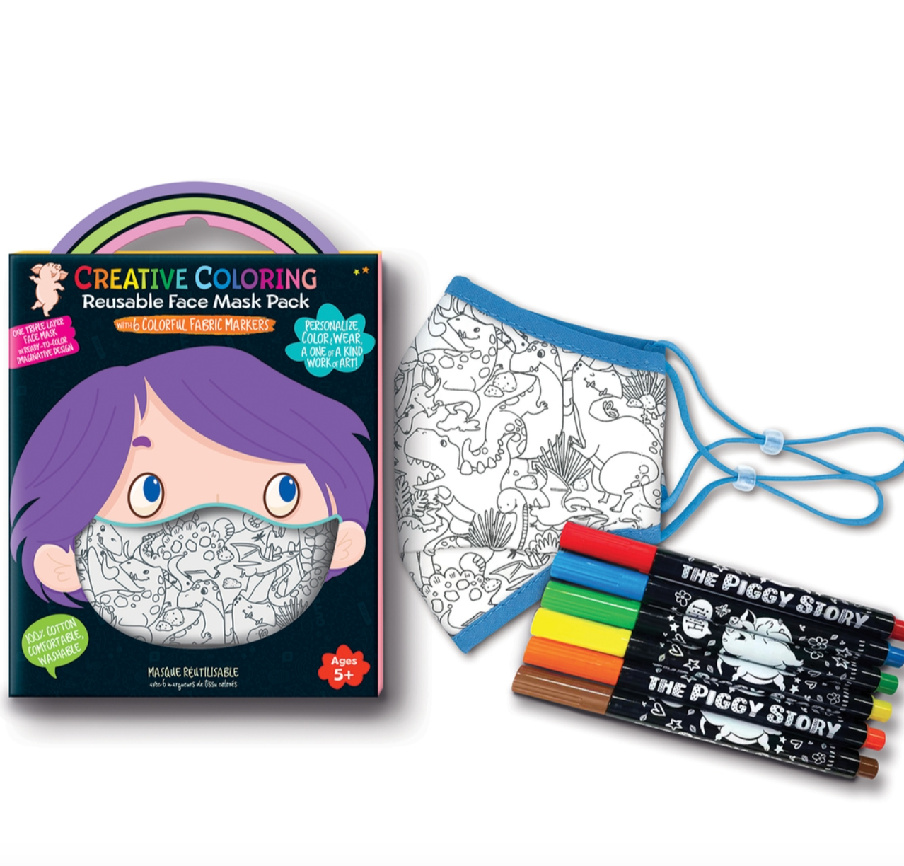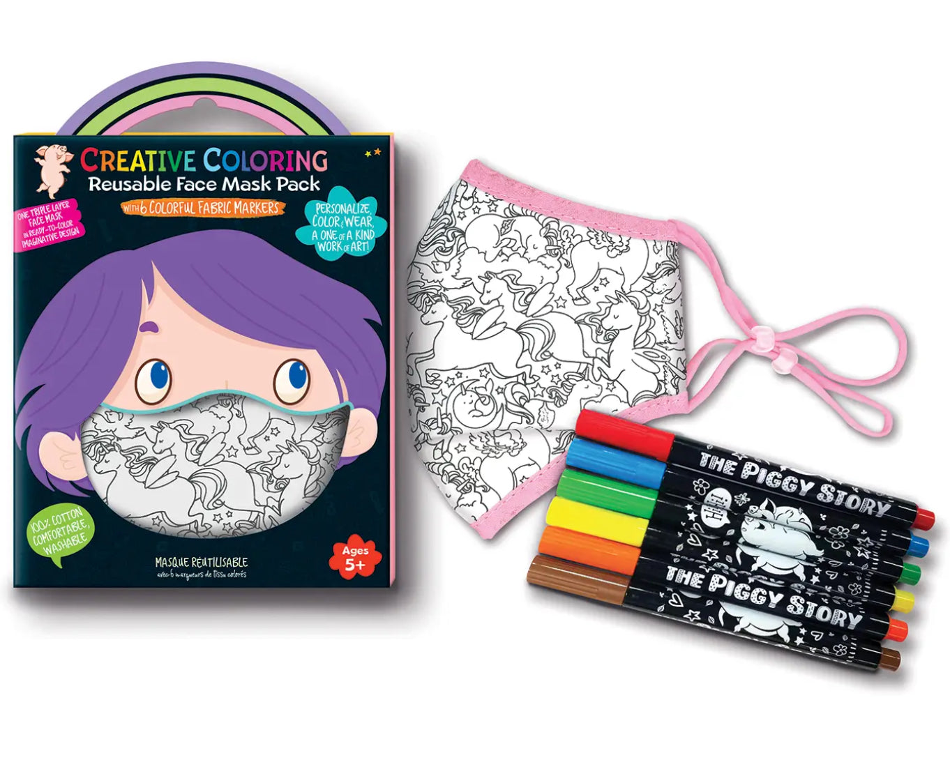 Personalize, Color & Wear, a One of a Kind Work of Art! Includes: 1 triple layer face mask in ready-to-color imaginative design for kids ages 5+ 6 colorful, non toxic fabric markers 100% cotton, comfortable, hand washable Three-Dimensional Structure to fit the face comfortably.