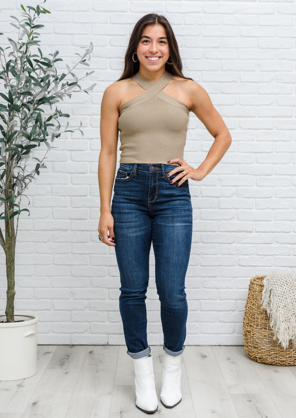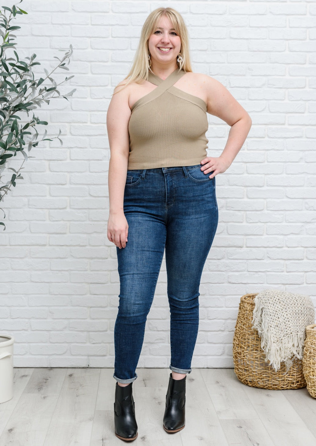 Product description: You'll look and feel amazing in the Crossways Halter Top! This stylish tank features a criss cross halter style neckline, stretchy thick rib knit fabric, and body hugging silhouette. The simple yet stunning details make this top perfect for elevating any outfit. Wear it with denim and heels for an on trend look! Crafted from 100% Nylon, this top is unbreakable and will last you through many wears. Plus, it's easy to care for - just wash cold and hang dry. Available in sizes S-2XL so you can find your perfect fit! Shop now to add this timeless piece to your wardrobe.