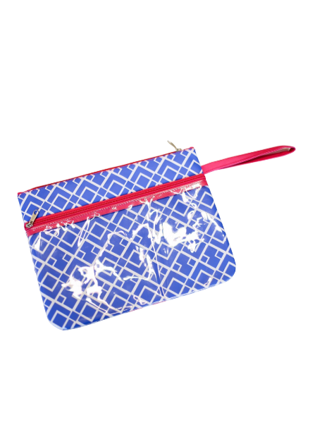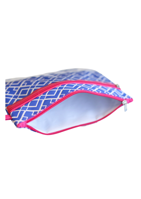 A geometric Delray print covers this wet/dry bag that will keep things clean and organized in your beach and pool bags. Finished with a handy wristlet strap, clear pocket on the back and top zip closure