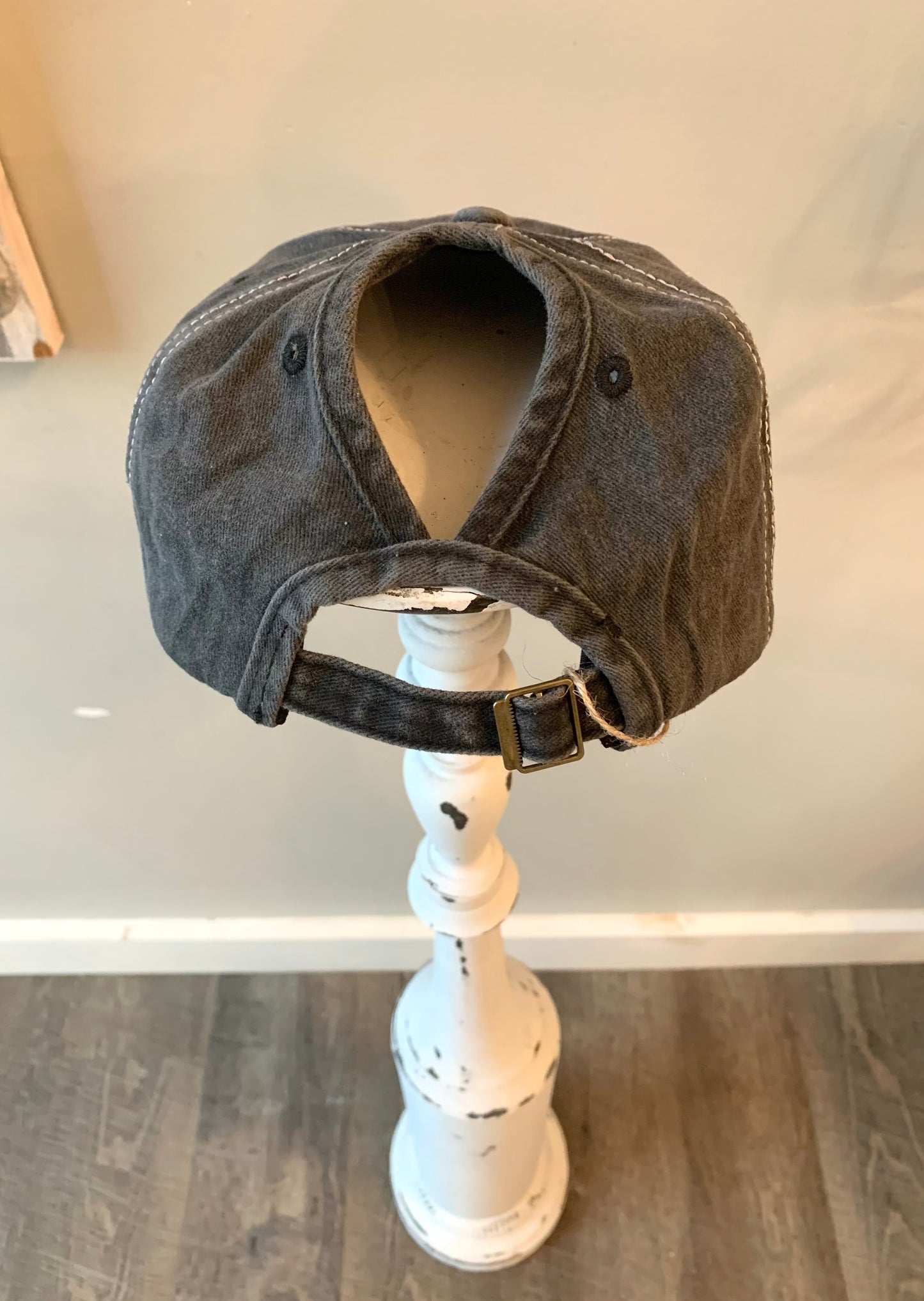 This Distressed American Flag Baseball Cap is designed to be an eye-catching addition to any wardrobe. The grey canvas hat features a vintage American Flag pattern for a patriotic touch. It also has a conveniently placed ponytail cut out. Make a statement with this unique and stylish hat.