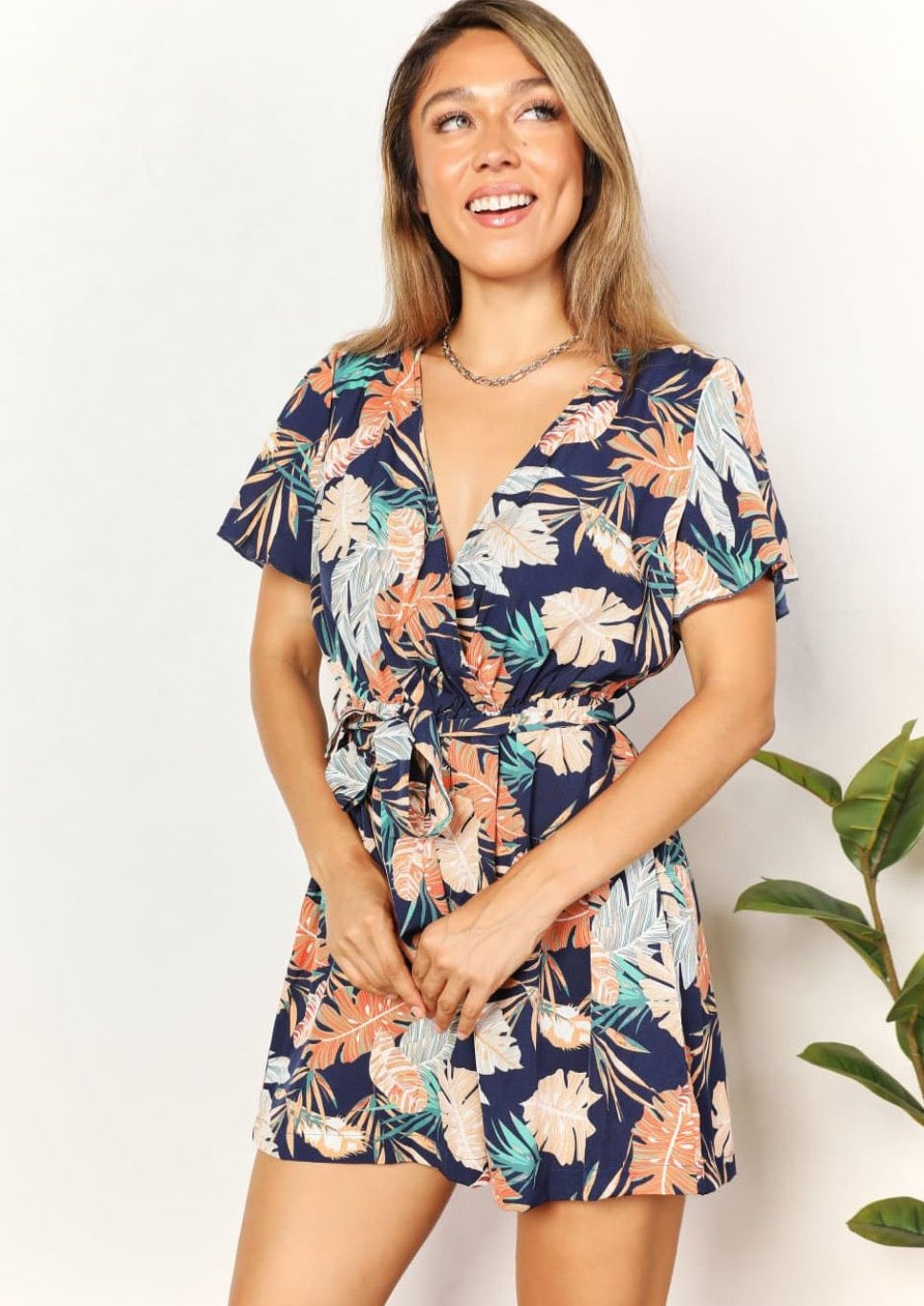 This botanical print romper features a surplice neckline, adding a touch of elegance and allure. The tie waist detail enhances your figure and provides a flattering fit. The short flutter sleeves add a playful and feminine touch to the romper. With its botanical print, it exudes a fresh and vibrant vibe. This romper is perfect for summer outings or special occasions, allowing you to look stylish and effortlessly chic.