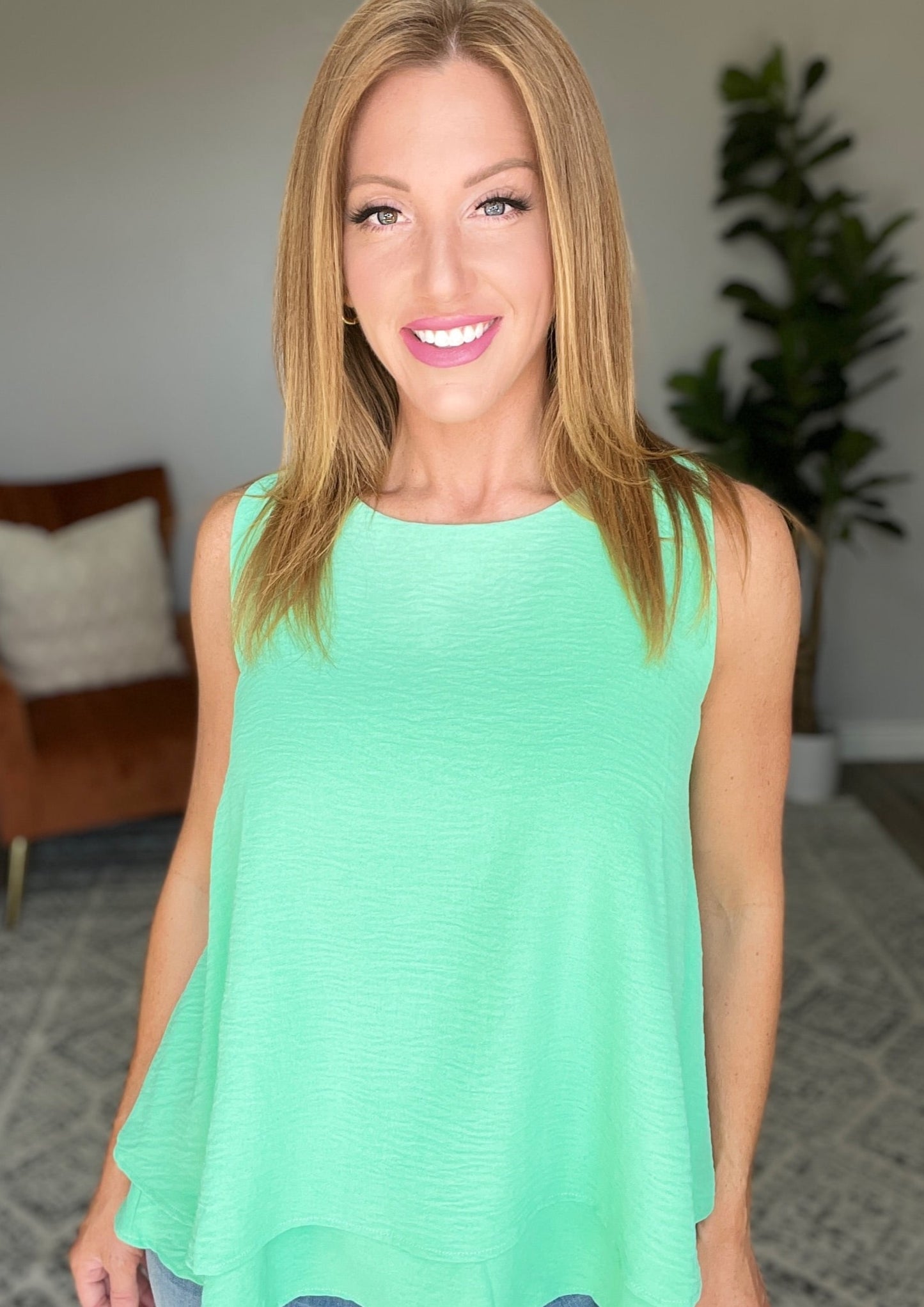 This stylish sleeveless top features double tiered flares and a keyhole button closure. Its classic design is perfect for any occasion, with a modern tiered hem for a flirty twist. Its lightweight, breathable fabric gives you all-day comfort and a flattering fit. Plus, the easy care fabric makes it a breeze to keep this top looking great.