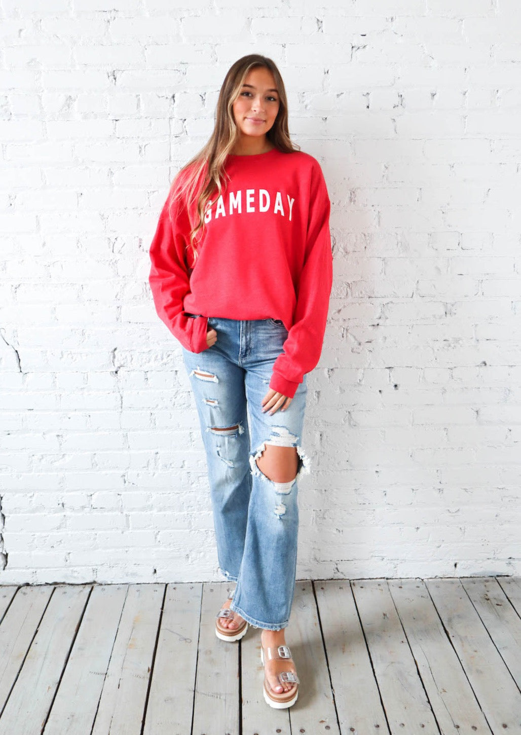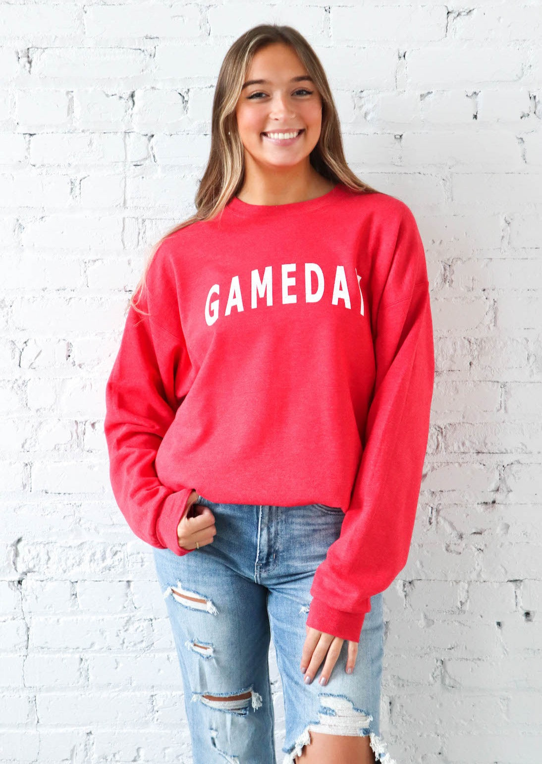 Our Gameday Crewneck Sweatshirt is the perfect way to show your team spirit! This red crewneck features white distressed letters for a classic look. You'll love its soft, comfortable fabric and unisex fit. Plus, it's handmade with high-quality materials that are sure to last season after season. With this sweatshirt, you get all the advantages of a stylish piece of clothing plus the benefit of supporting your favorite team. Get ready to cheer on game day in style!