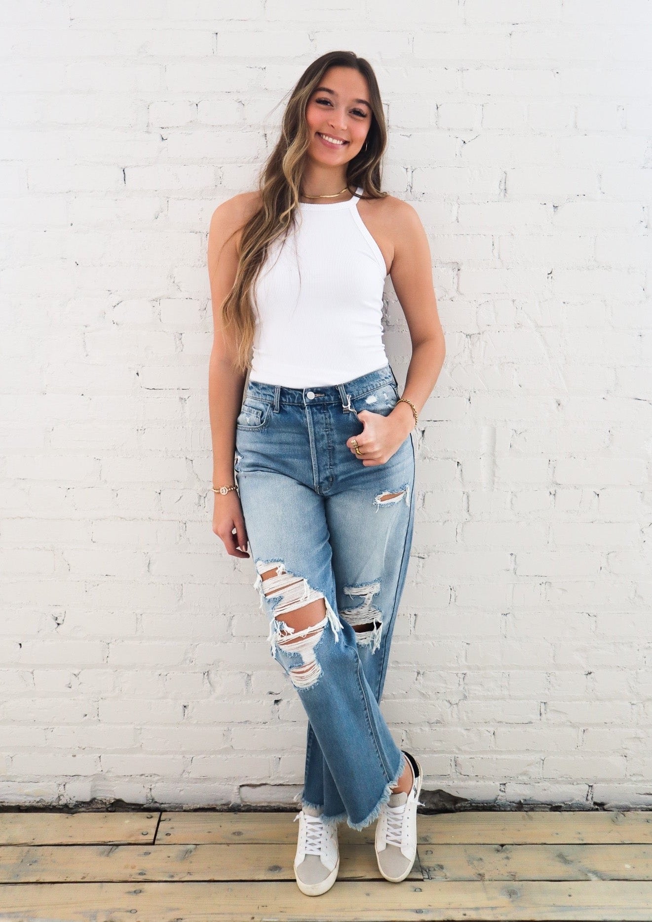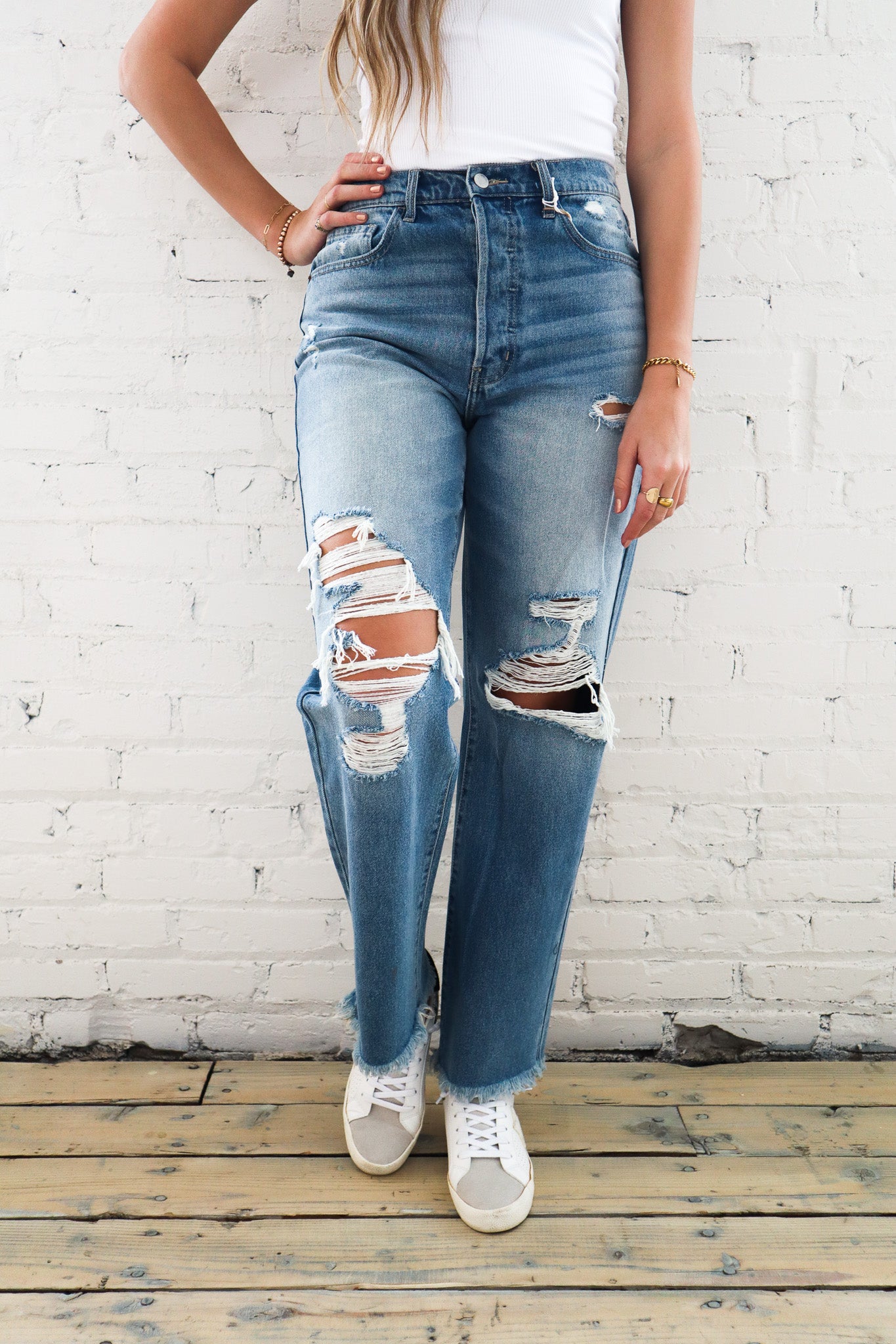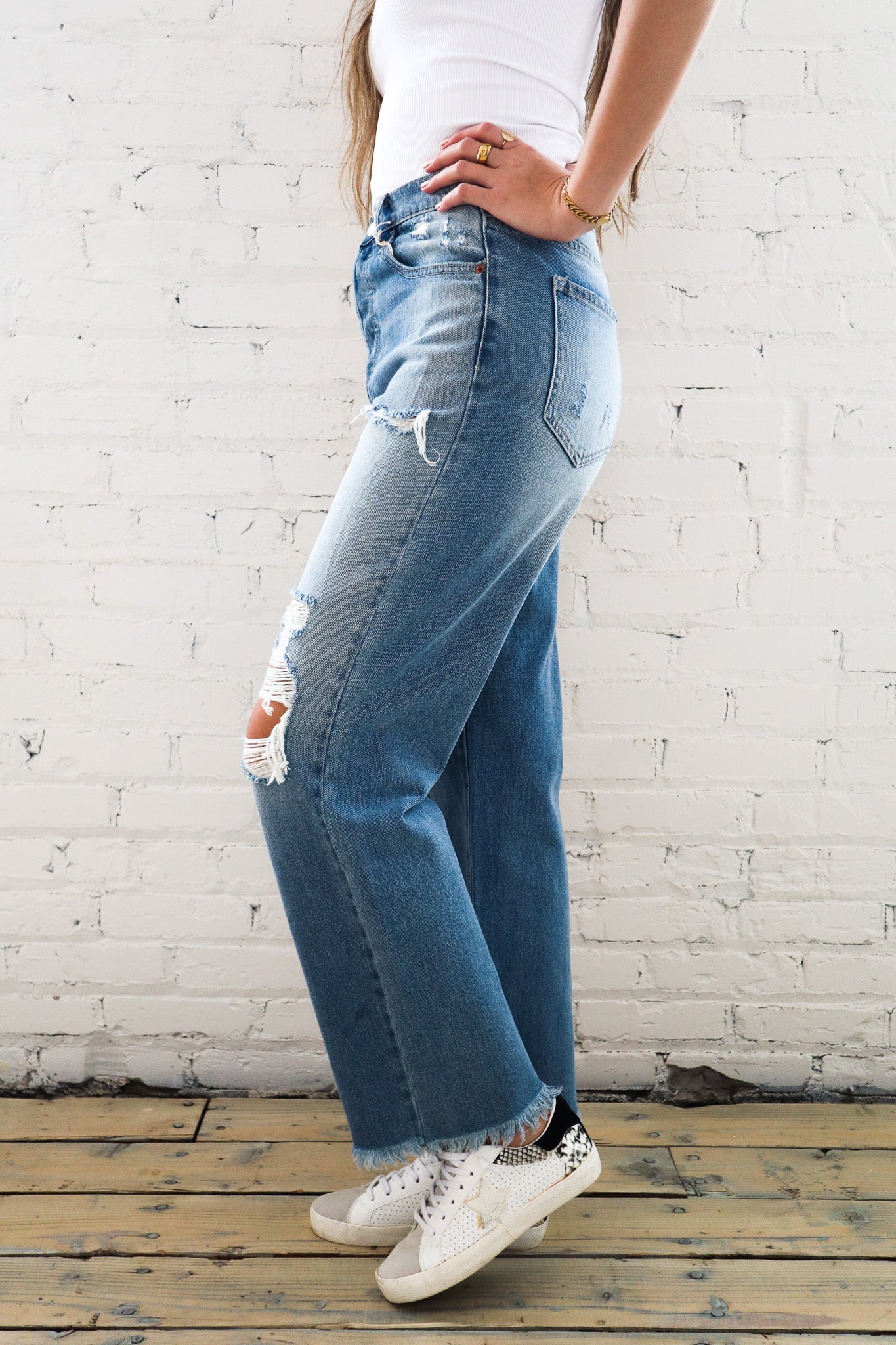 The 90s called and they wanted to tell you how good you look in the super high ride frayed hem Dad Jeans! Sturdy, light wash denim shapes these dad worthy jeans that have a high wasted fit with belt loops and a five pocket cut. The relaxed straight left have distressing detail finished by the frayed hem.