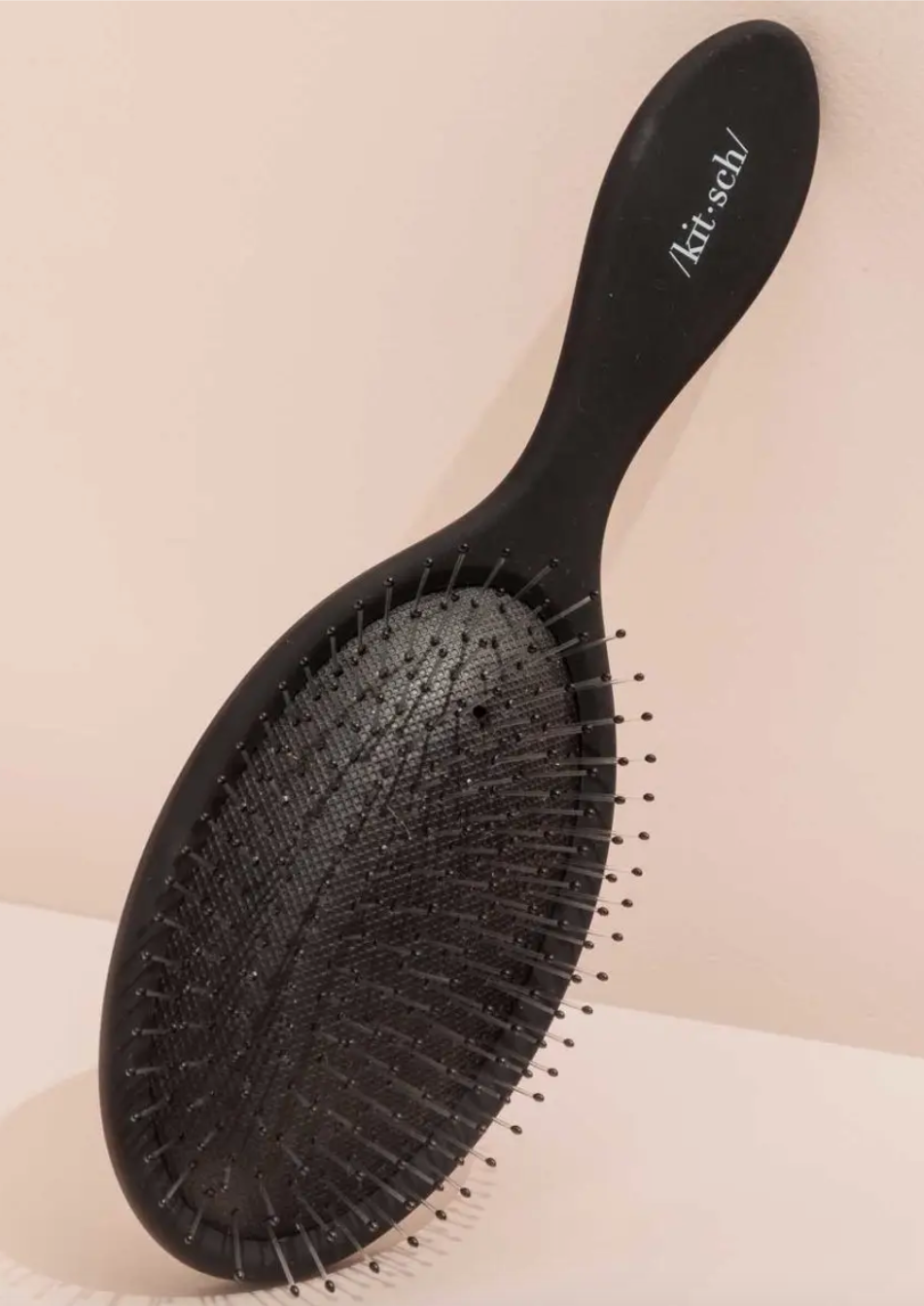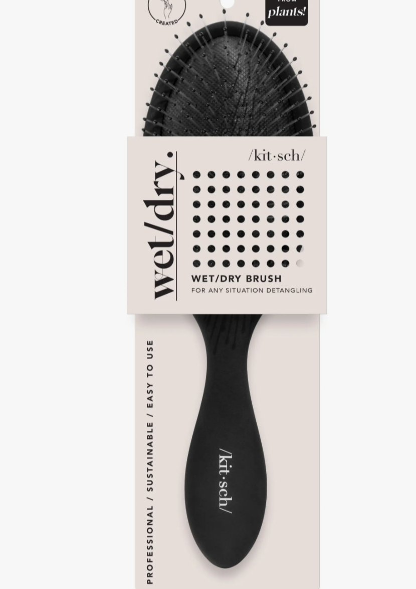 Wet/Dry Brush For All-Purpose Detangling WHAT: The Kitsch Wet/Dry Brush is the perfect hair tool for everyday hair care. HOW: Its thin flexible bristles comb through fragile hair without snagging or breaking hair. WHY: Use this brush to smooth out knots and disperse products evenly throughout wet or dry hair. Benefits: -Helps reduce hair breakage -Gently detangles wet & dry hair Smooths frizz -Stimulates scalp for hair growth -Ideal for straight sleek hair styles -No-slip coating for ultimate grip Composition: Brush Handle: PLA environmentally friendly corn starch fibers Cushion: Natural rubber (biodegradable) Bristles: Recycled nylon Product Information: 1.5” wide brush handle 3” wide cushion 9” long