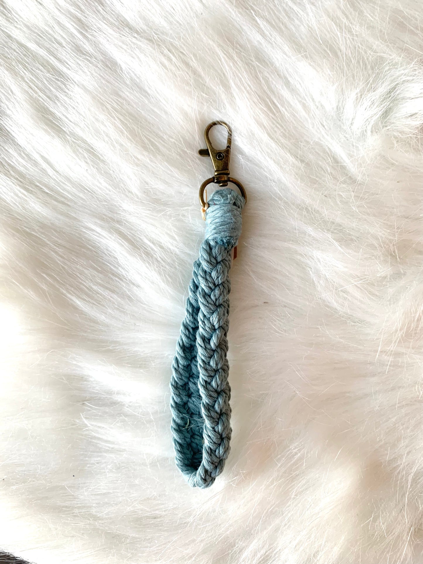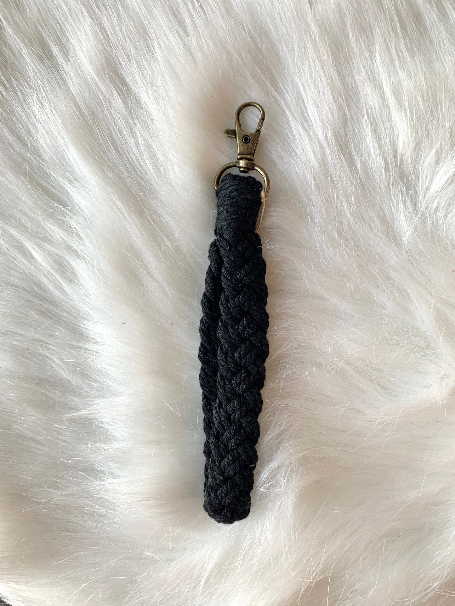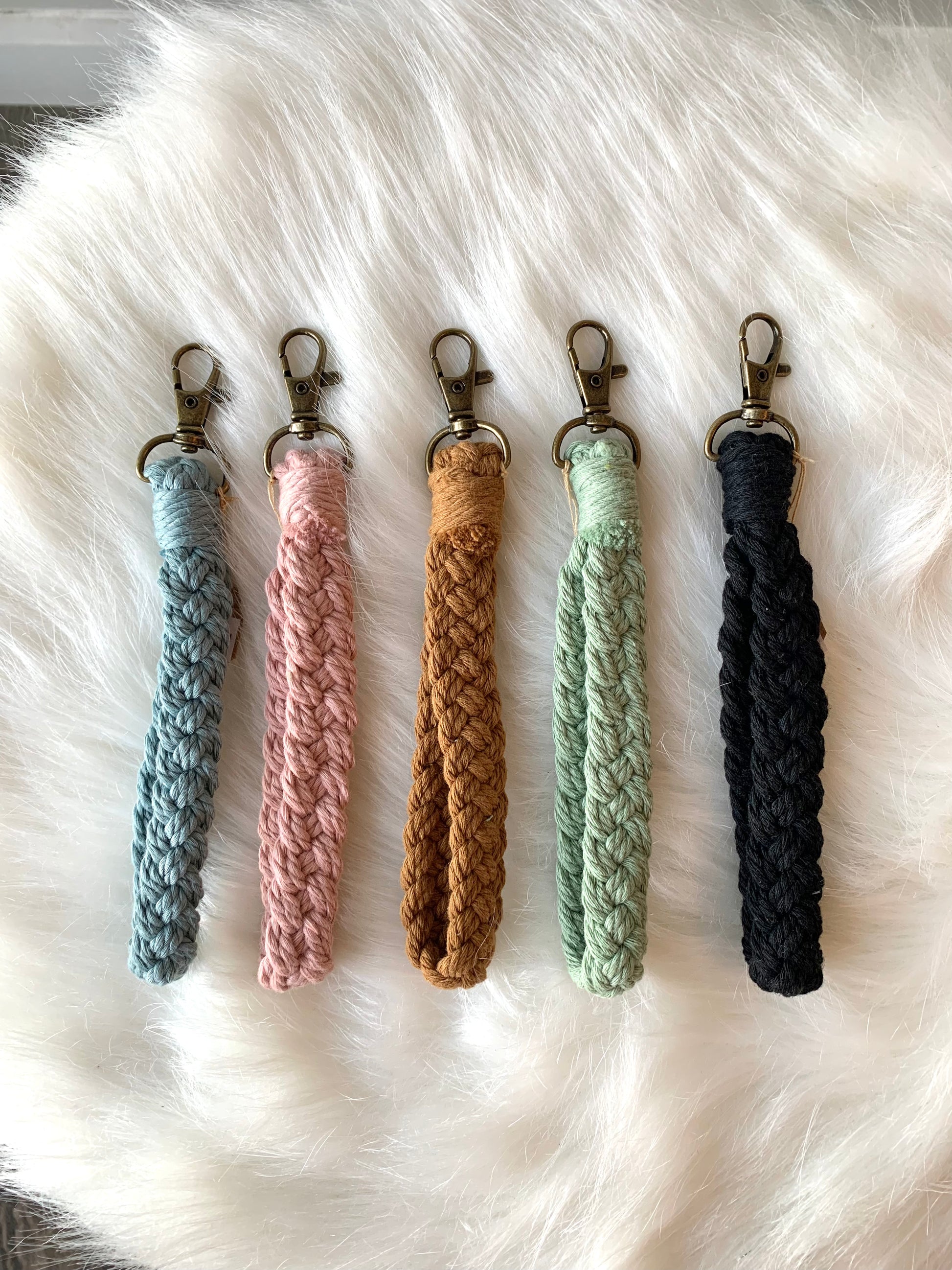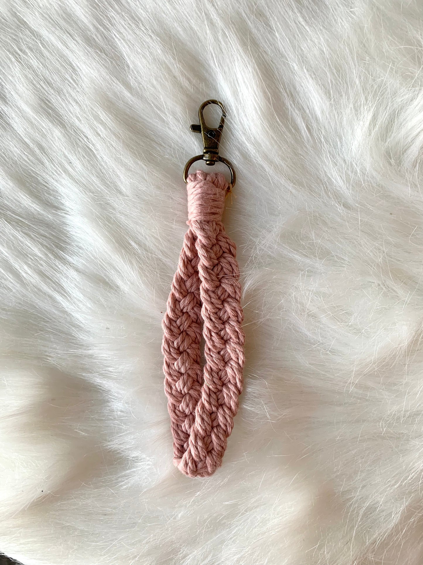A braided macrame keychain with a wrist loop. Perfect for attaching your keys to! This versatile accessory is perfect for style and convenience. It's also designed to securely hold your keys, offering a worry-free way to store them.