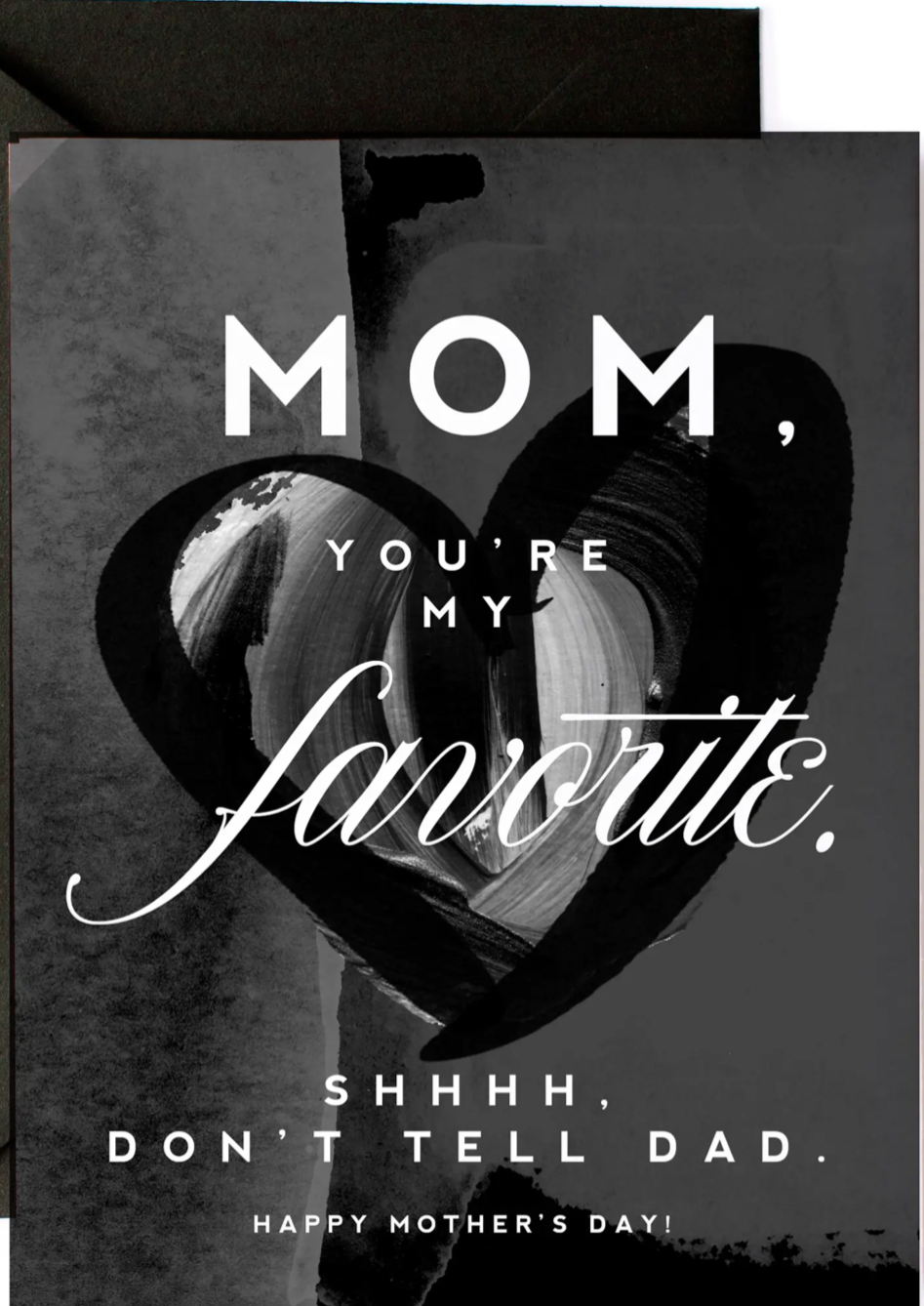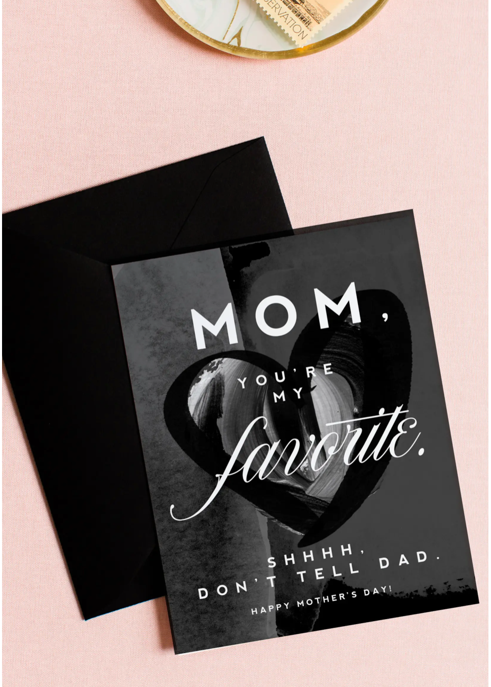 You're sure to make your mom smile with this unique and funny "Mom You're My Favorite" card! This handmade, 4.25" x 5.5" folded greeting card is printed on bright white, thick recycled card stock and comes with a black A2 envelope for easy mailing. With the message "Mom, you're my favorite. Shhhh, don't tell Dad. Happy Mother's Day!" written inside - it's sure to bring a laugh! Plus, the blank interior allows plenty of room for your own personal message too! Unbreakable quality ensures that your mom will be able to keep this card forever as a reminder of how much she means to you! Make her day extra special by sending her this one-of-a-kind Mother's Day gift today!