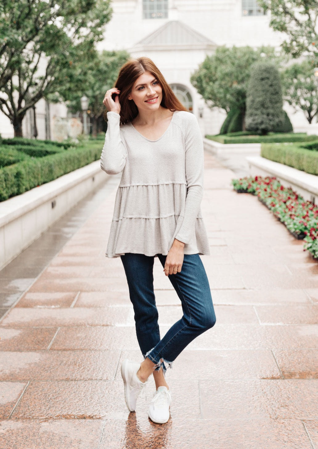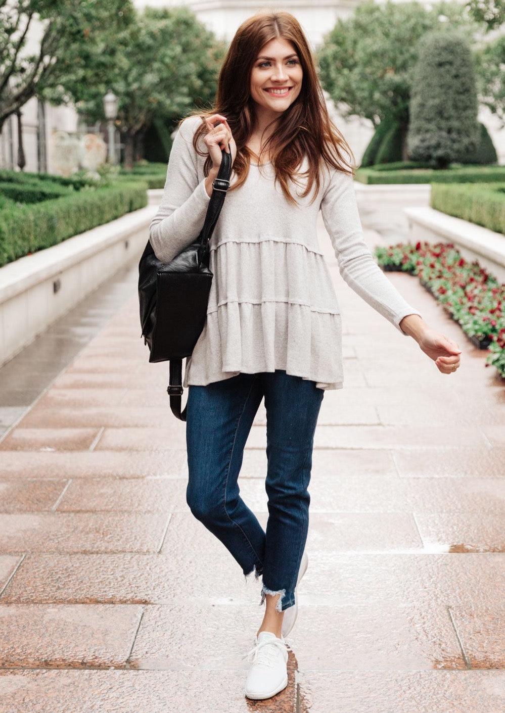 Product description: You'll love the Nicely Done Tiered Top in Gray! This lightweight and soft top has a flowy silhouette created by the gathered tiers and long sleeves. It's made of 63% Polyester, 34% Rayon, 3% Spandex and is proudly Made In USA. The stretchy material makes it comfortable to wear while looking darling with jeans and tall boots. Plus, it fits true to size - just check out the measurements listed below! Make sure you pair this top with The Golden Loops Beaded Earrings, Oval Stone Charm Chain Necklace, Time To Relax Jeans or Take It Up A Notch Jeans for an effortless look. Get ready to feel comfy yet stylish in this gray tiered top!