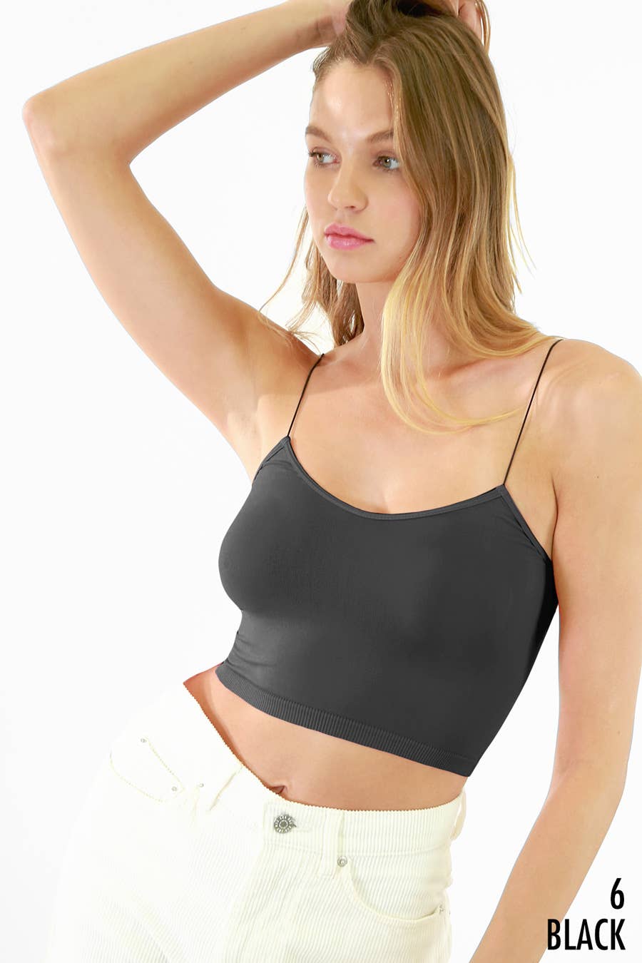 Indulge in the perfect blend of luxury and comfort with the Skinny Strap Cropped Cami - Women's Knit Top in White. Made in the USA with a seamless design and fabric of 92% Nylon / 8% Spandex, this cami boasts a sophisticated and exclusive feel. Embrace the chic sportiness with the ribbed hem, making this a must-have for your summer wardrobe.