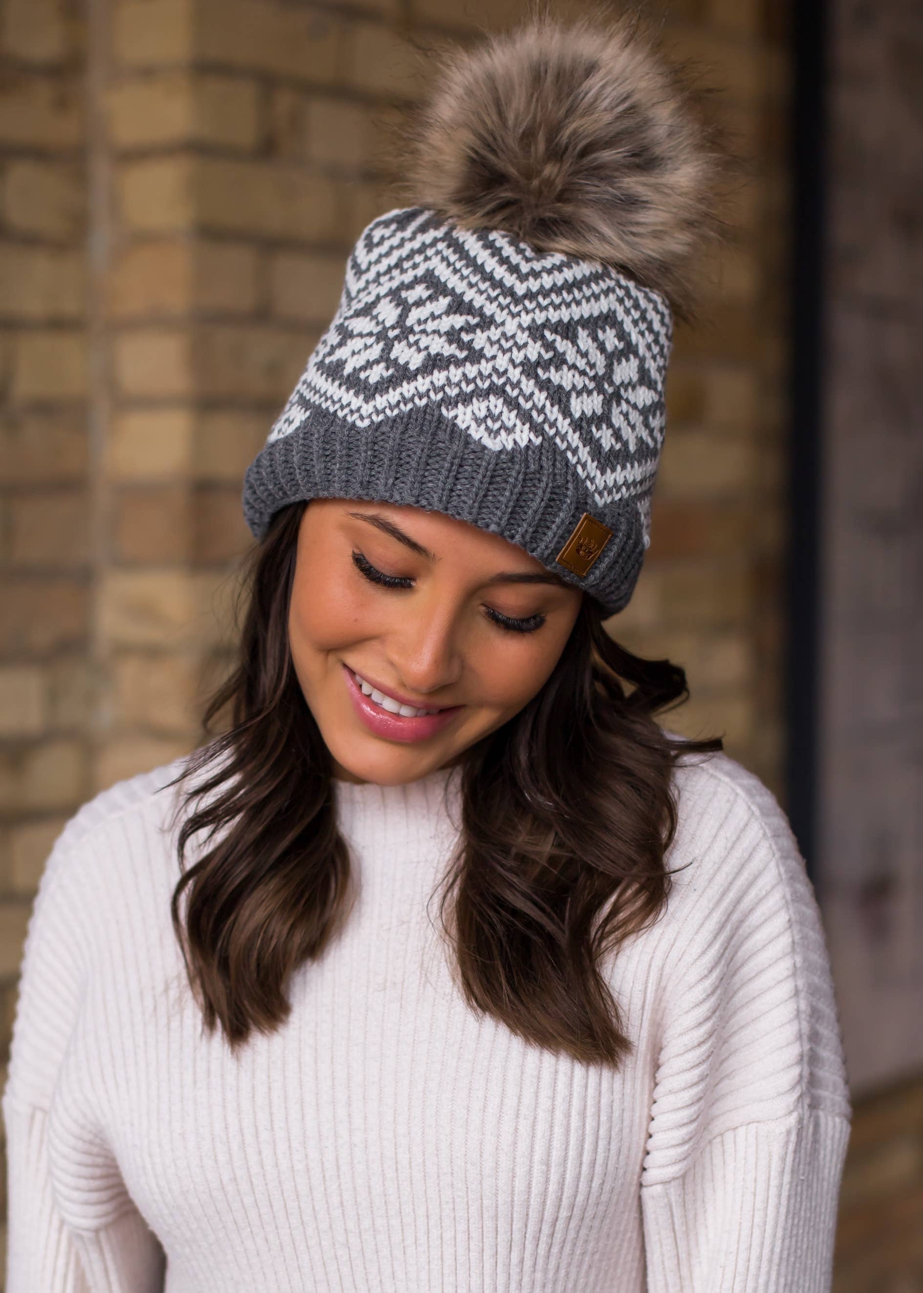 Grey & white snowflake knit hat Natural faux fur pom accent.  Fleece lined.