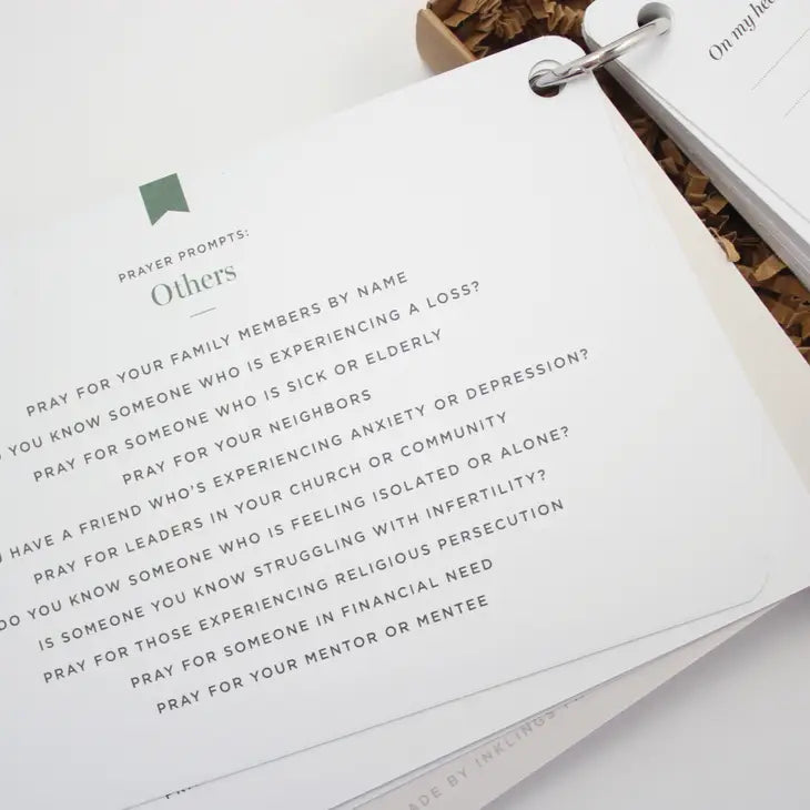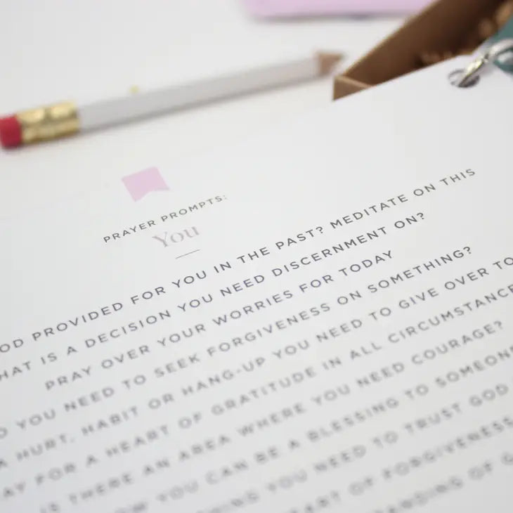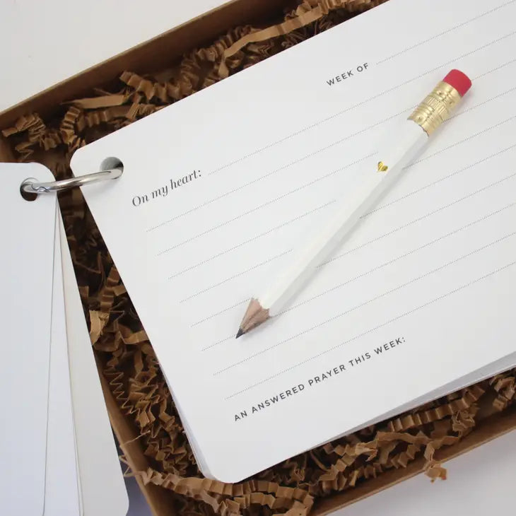 The Prayer Journal is a simplified way to keep track of prayer requests and answers. This thoughtfully-made journal features beautifully-illustrated dividers, with prayer and reflection prompts on the backs! Journal pages are open-ended, with 26 double-sided journal pages (52 journal entries... one per week for a year!)