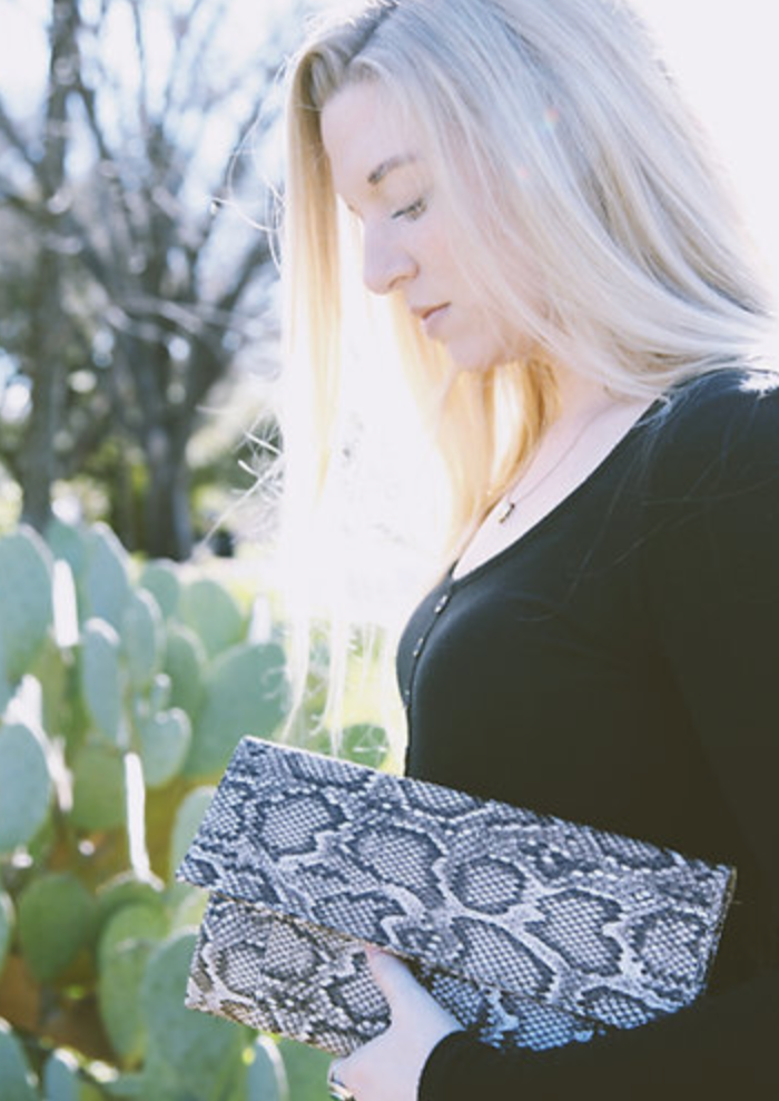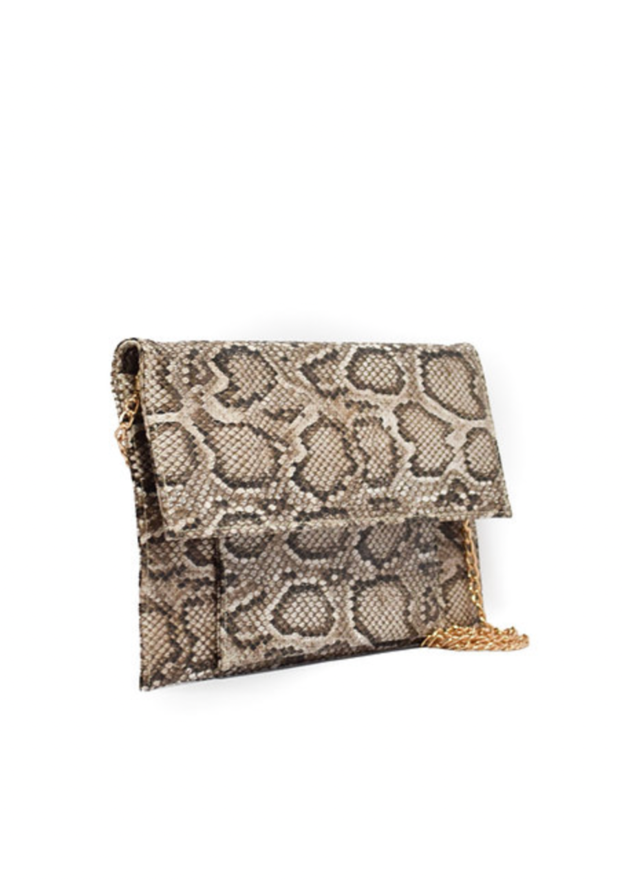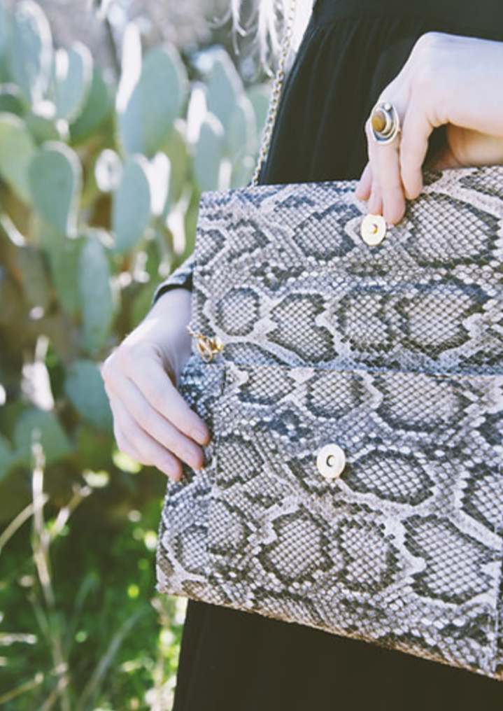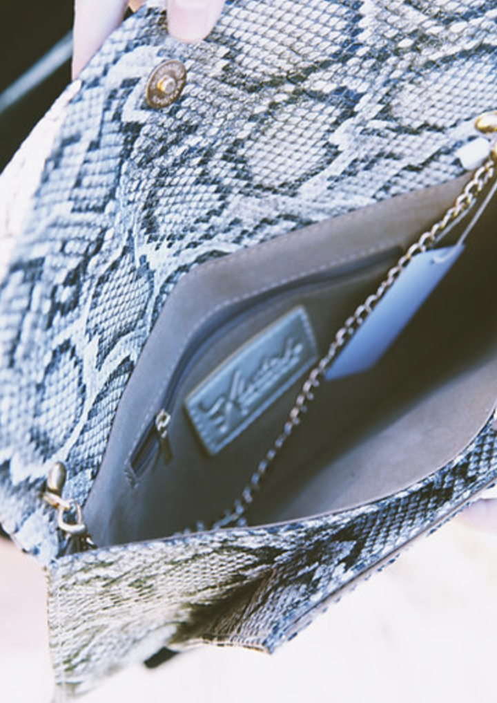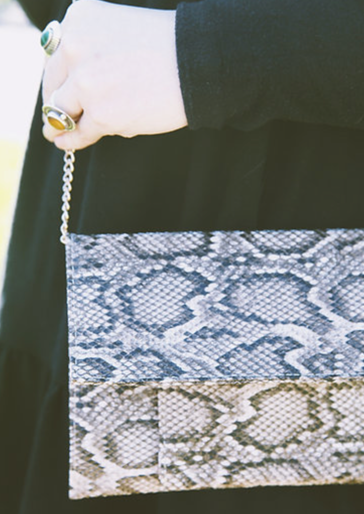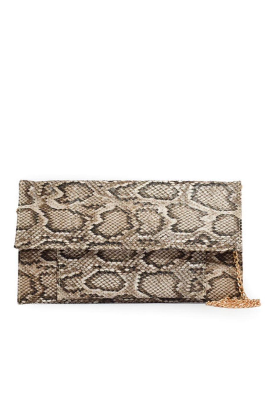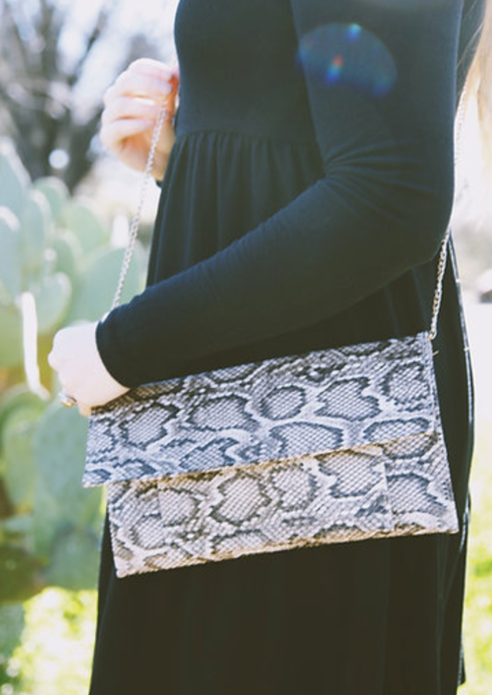 Embossed Faux Python Vegan Leather Envelope Klutch features the perfect pocket under front flap for toting your passport. Pinstripe Interior boasts zipper pocket and removable 42" gold chain for cross-body or shoulder bag wear.