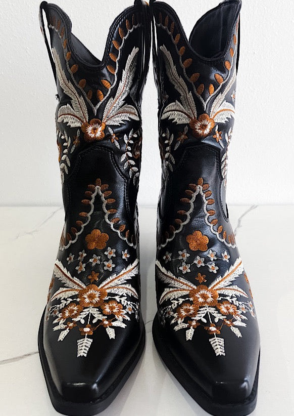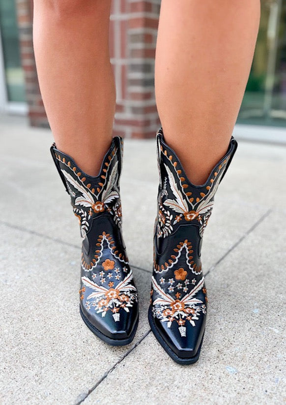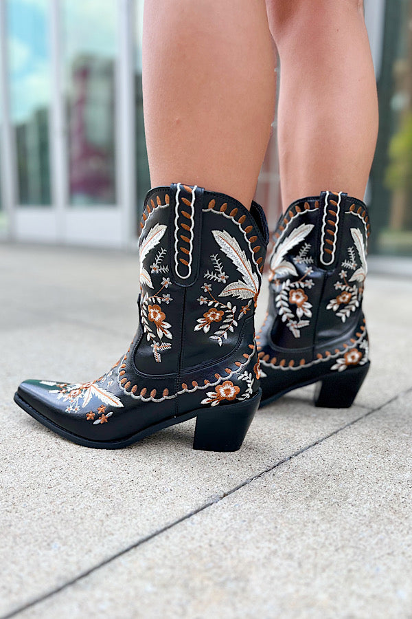 Let's Go Girls! These beautiful, embroidered floral western booties were made for dancing! The buttery leather and wear-all-day comfort is too good to pass up! Dress them down with denim shorts and a graphic tee, or dress up with your favorite mini or maxi. These boots are perfect for any season!