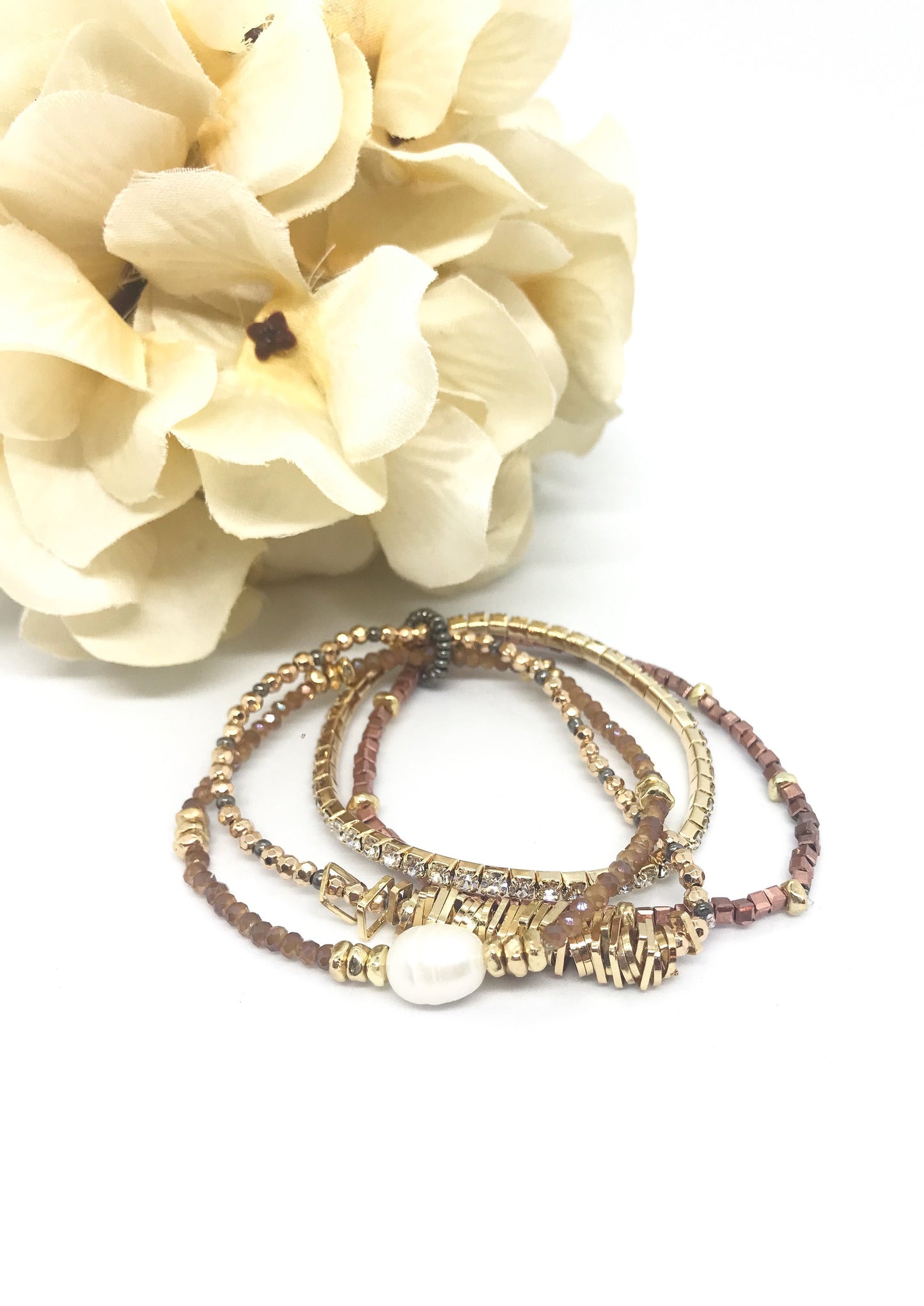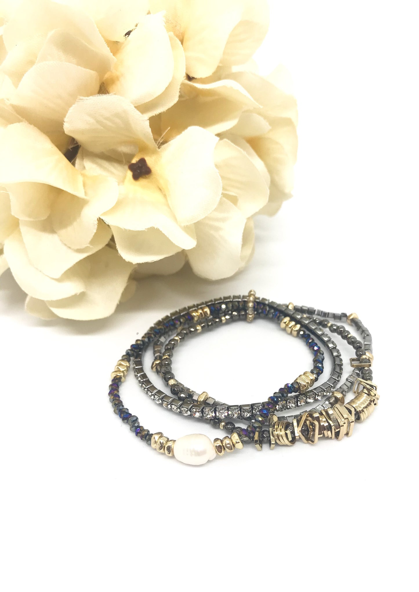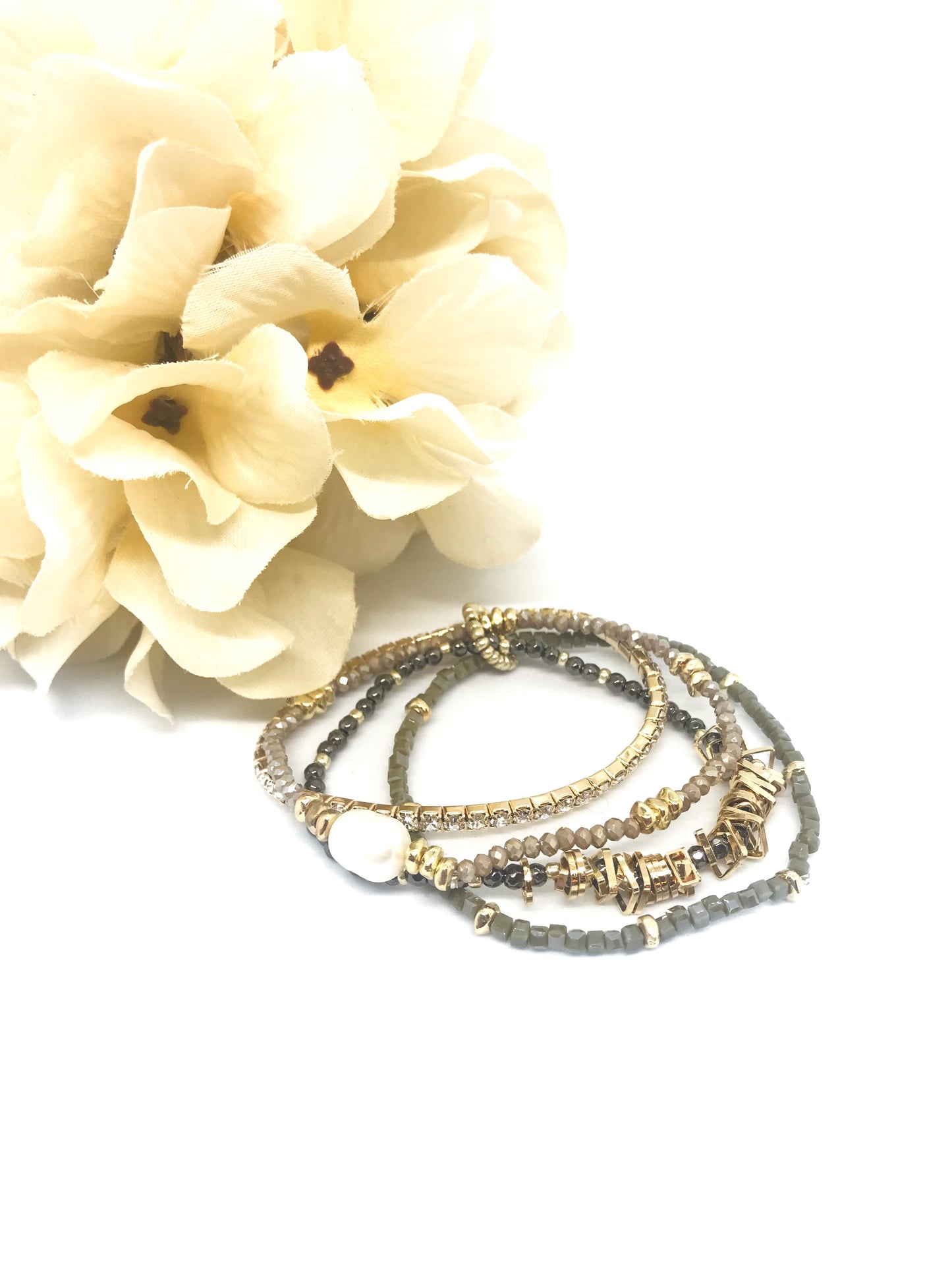 No need to try and pair bracelets together with this already stackable set! 3 different colors to pick from and all gorgeous! Simple yet stunning with the sparkles and gold.