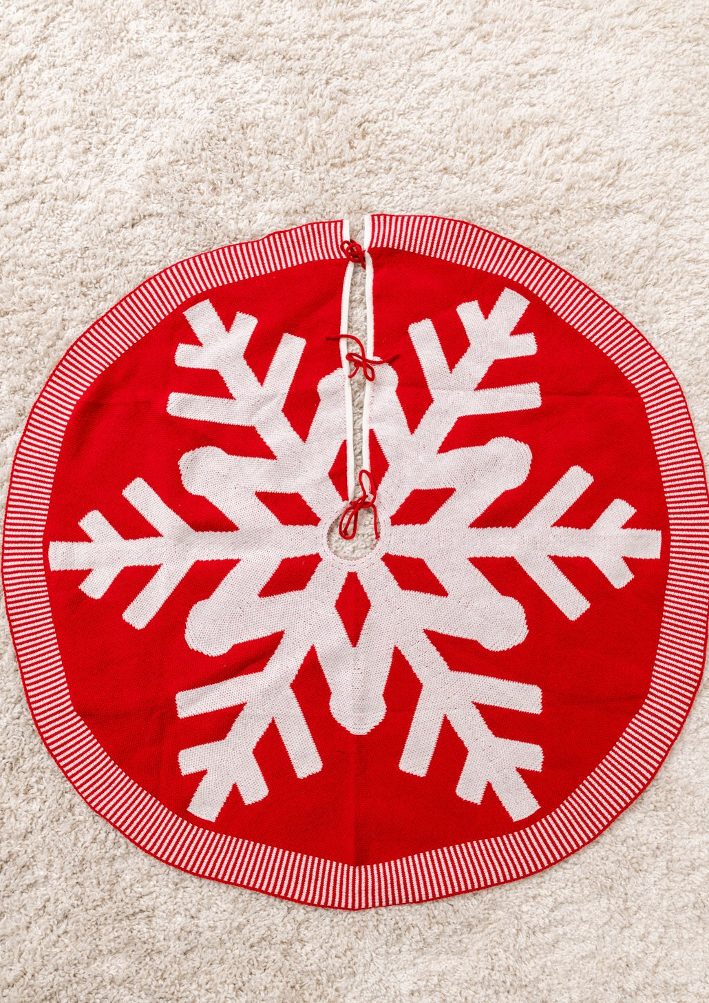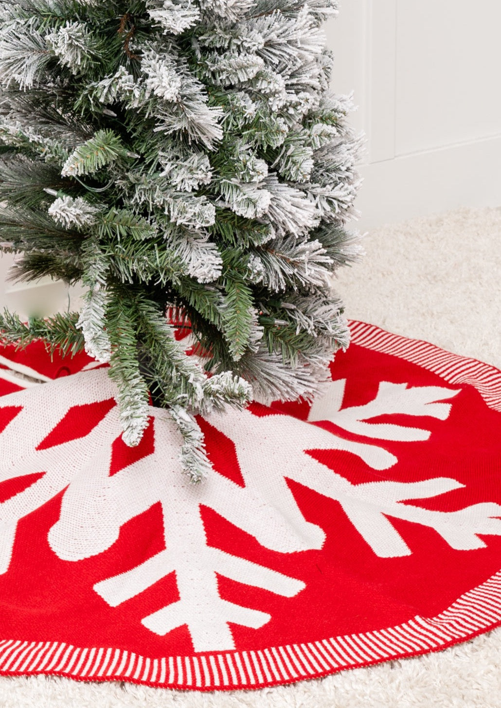 Your Christmas tree isn't complete until you add the Snowflake Knit Tree Skirt! A stretchy knit fabric shapes this adorable tree skirt with a contrasting white snowflake design and a striped trim. A slit with three tie detail makes for easy on and off.