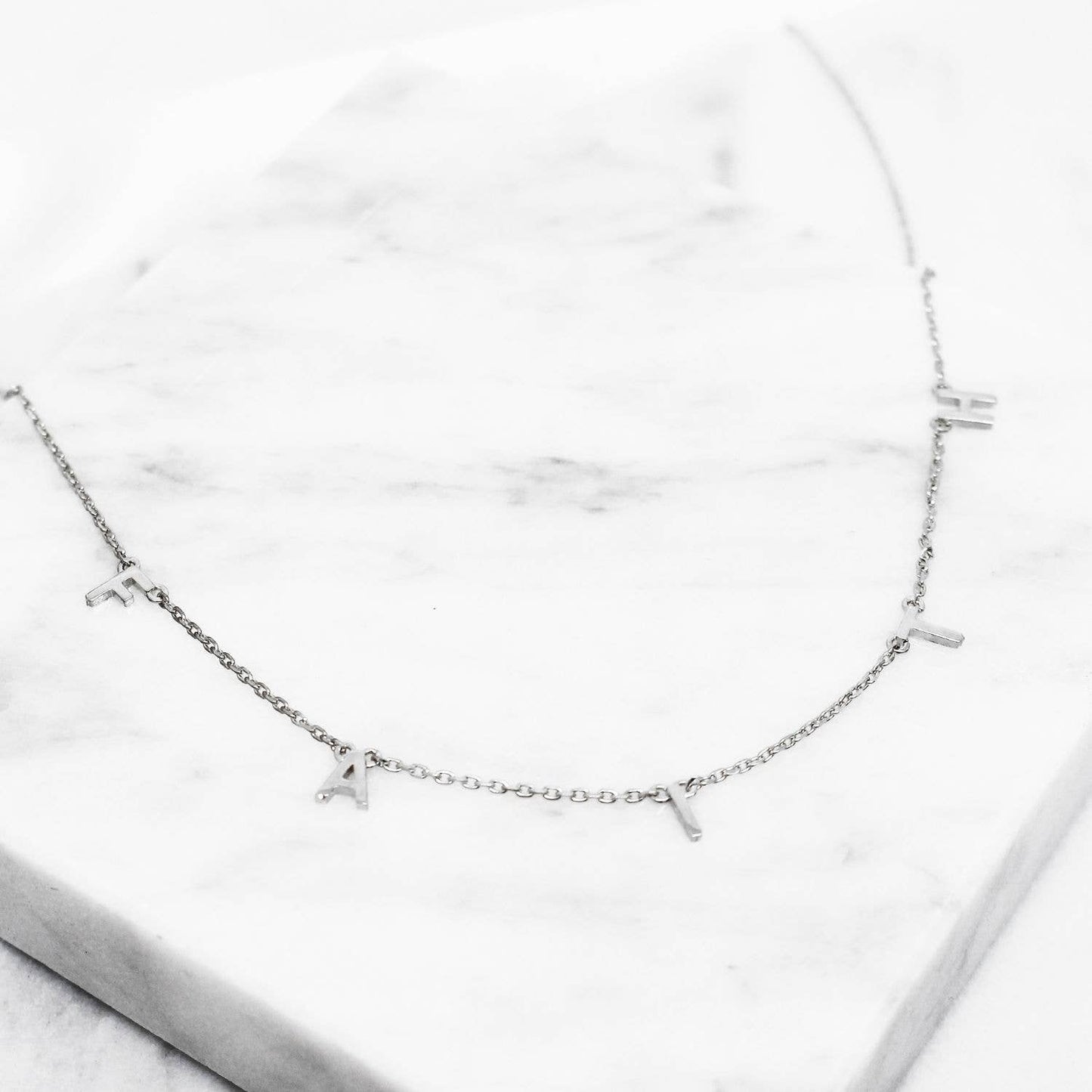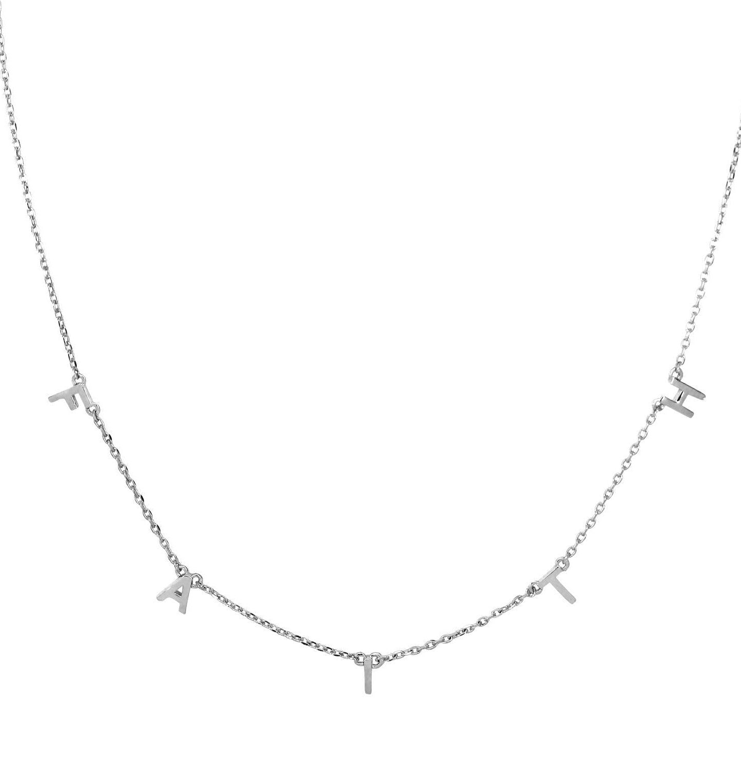 Imagine wearing the F.A.I.T.H. Necklace from our Studio Collection! This quirky piece features delicate letters that spell out the word "faith." Made of brass and plated in silver, it measures 15" in length. How fun and playful is that?!