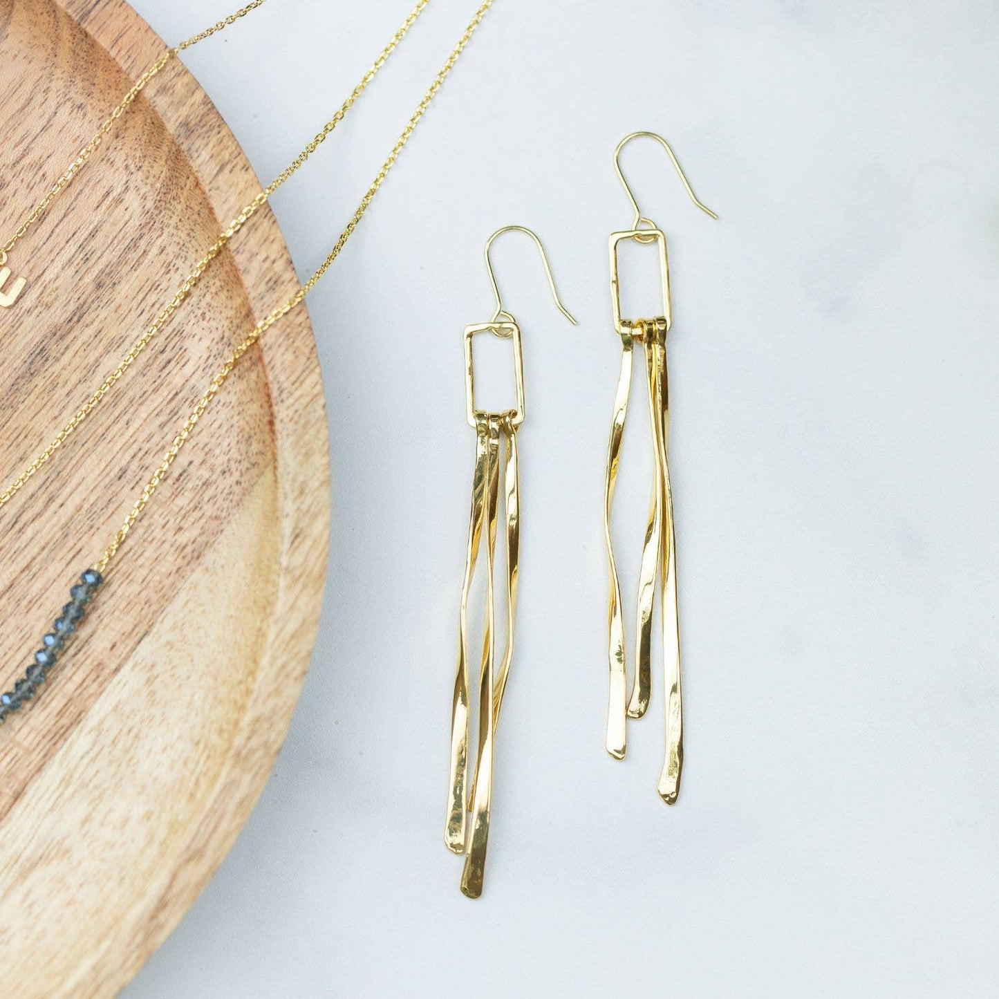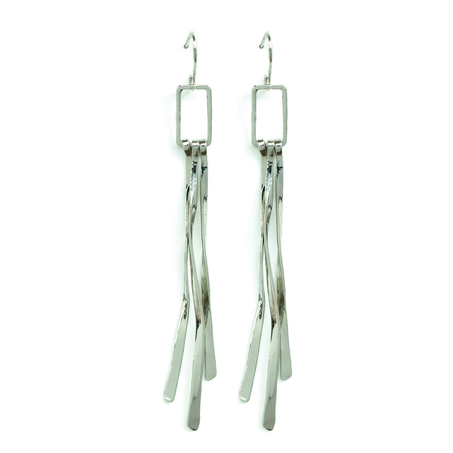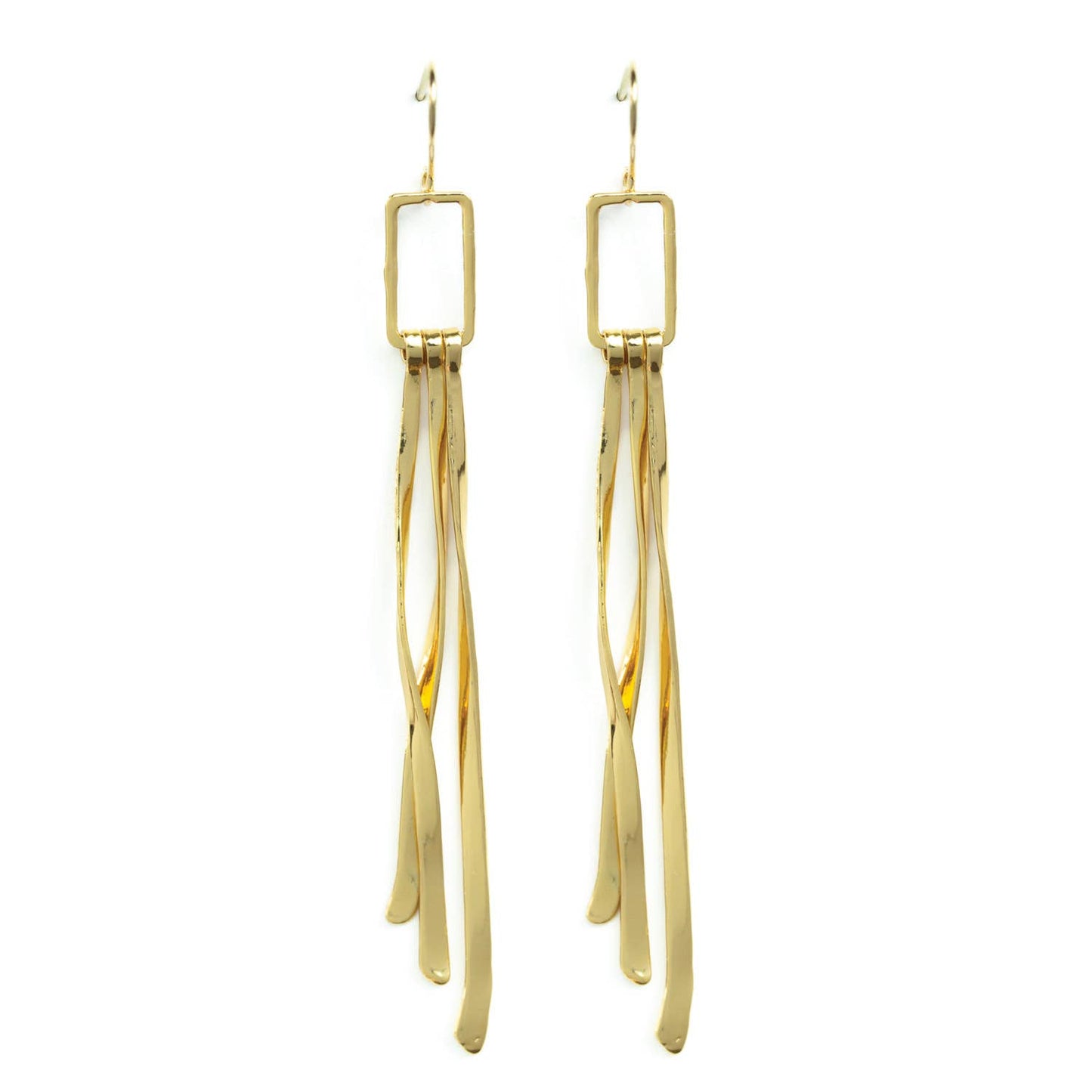 Get ready to spice up your look with these stunning open rectangle earrings featuring three long swirls. Made of brass and plated with gold, these earrings have a drop of 3.5 inches that will make you stand out from the crowd.