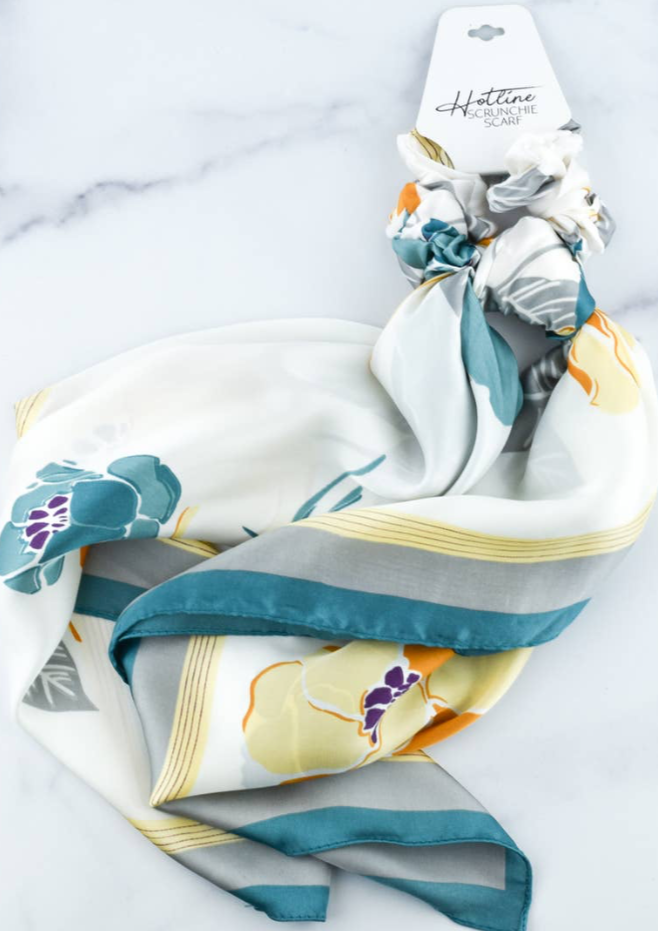 These Scrunchie Scarves are made from quality silk-feeling materials. They open up to a large square and can be detached from the scrunchie so they can be used in many different ways.