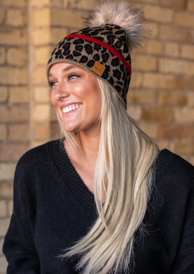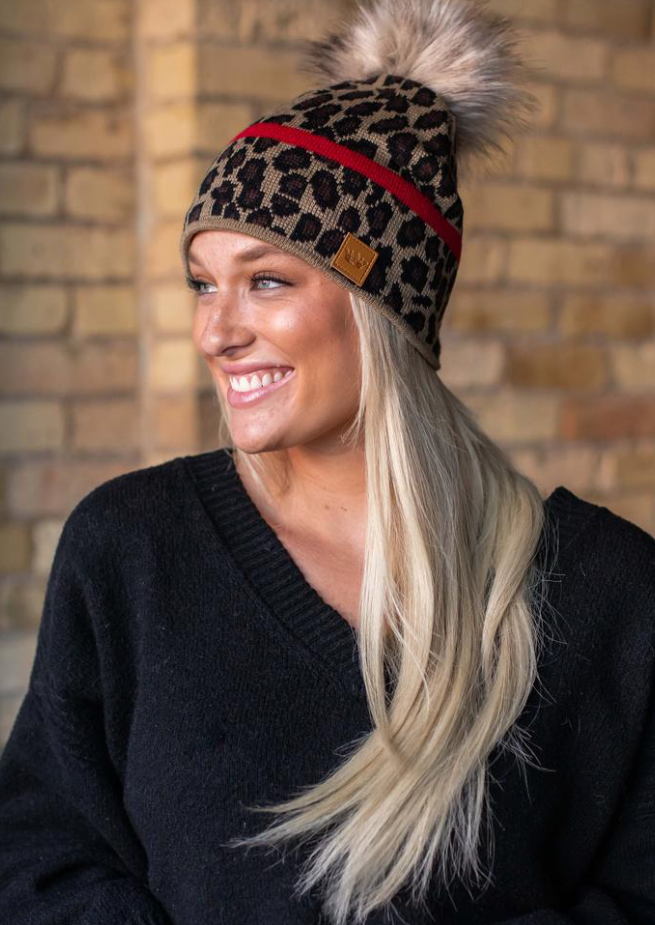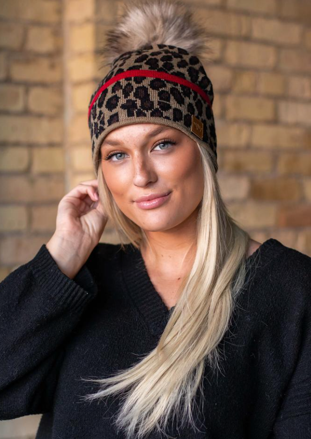 Leopard with red stripe fleece lined knit hat with pom detail.