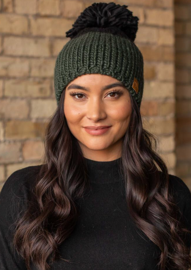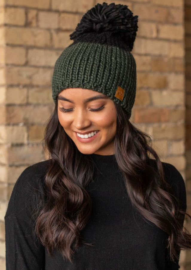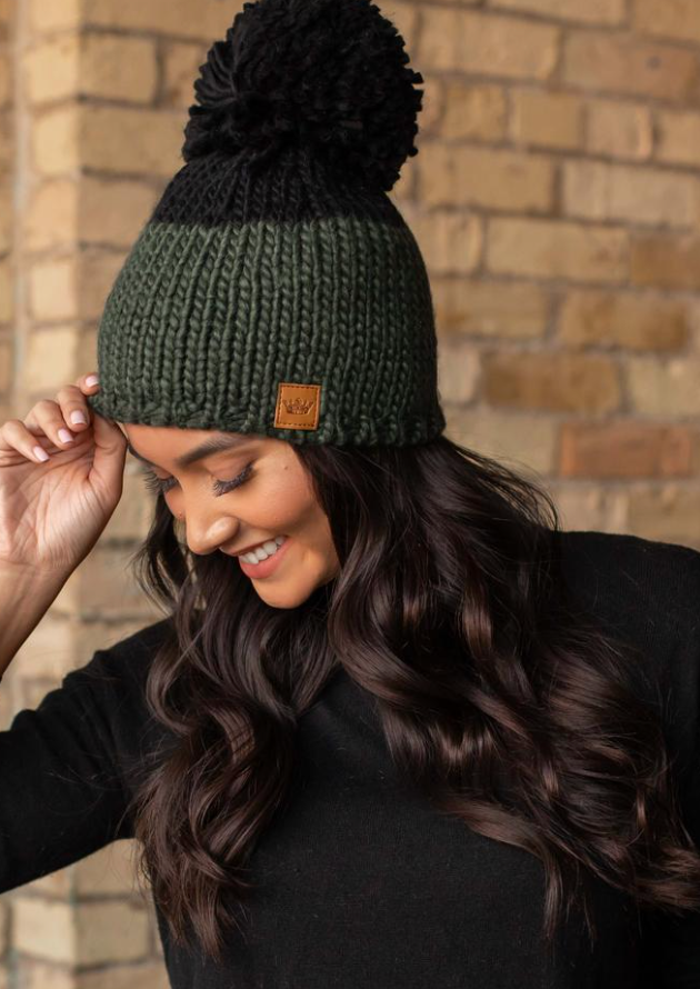 Hunter green and black color block fleece lined knit hat with large pom accent.