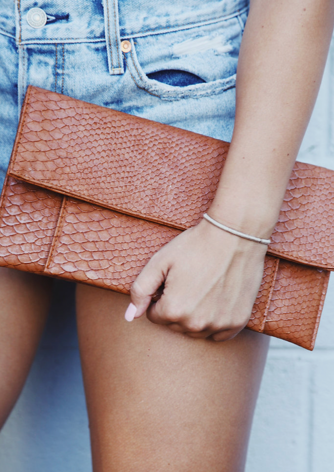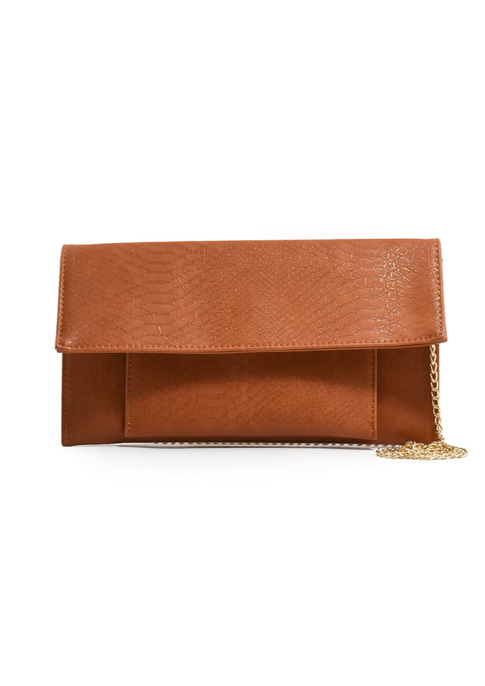 Stamped Cognac Vegan Leather Envelope Klutch features the perfect pocket under front flap for toting your passport. Pinstripe Interior boasts zipper pocket and removable 42" gold chain for cross-body or shoulder bag wear.