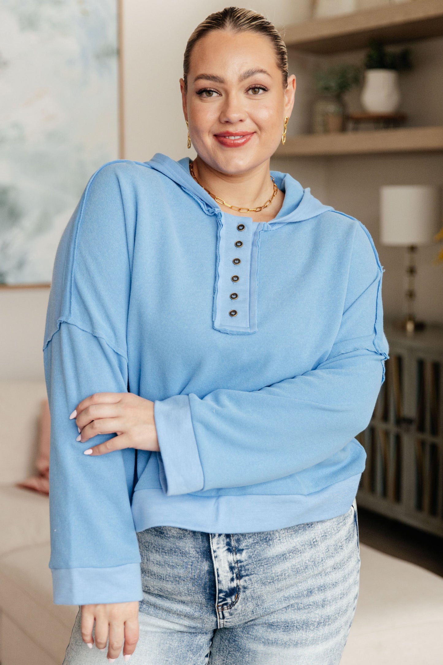 Stay cozy and stylish in the Throwback Heartthrob Hoodie in Beige. This button-up layer features a generous hood, exposed seams, and cuffed edges to keep you in comfort and style. Perfect for layering and keeping warm, you'll love the look and feel of this throwback layer!