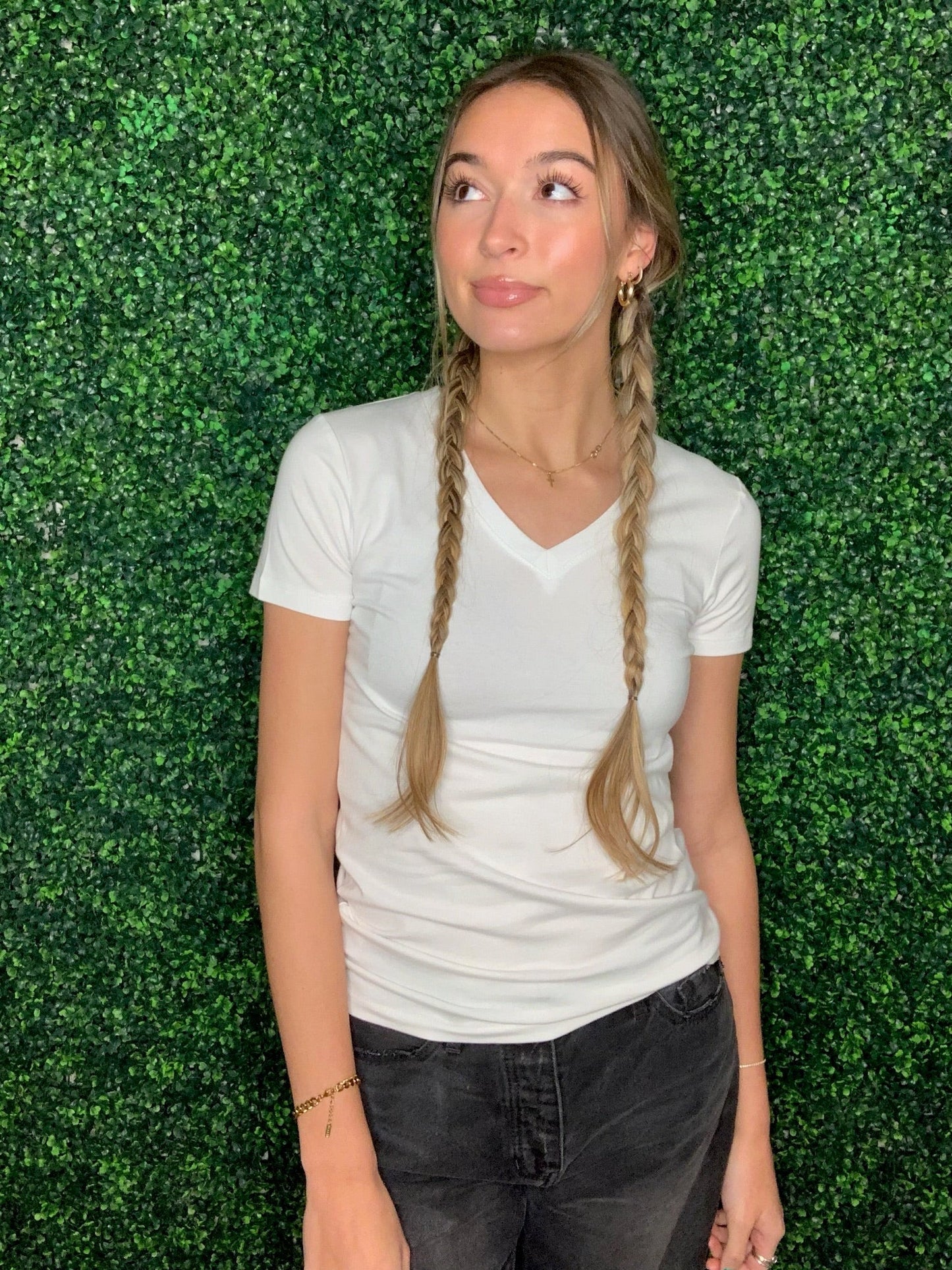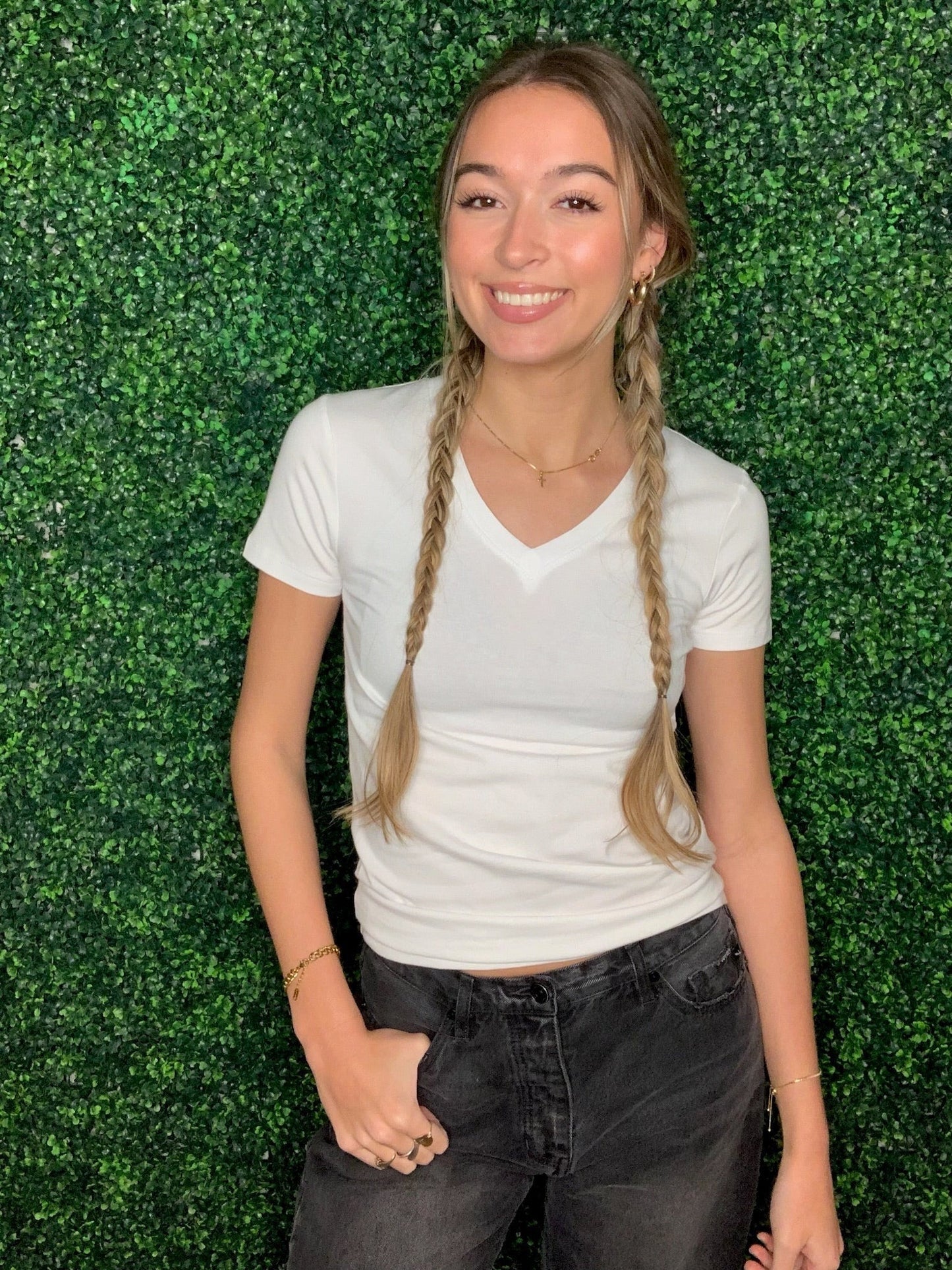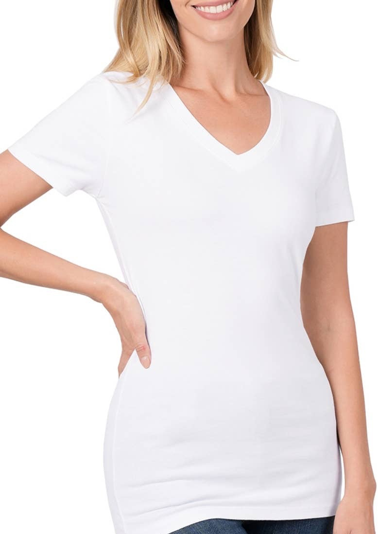 Tiffany's Basic Short Sleeve V Neck Top in White 1-2-2-1 is the perfect addition to your wardrobe! With a total body length of 26.5" and a bust of 29", this top is both comfortable and stylish. It's made from a unique blend of 60% cotton, 35% polyester, and 5% spandex, and is available in sizes S-M-L-XL. Please note that the color may vary slightly due to monitor resolution, but we promise it will still look fabulous! Fabric consists of 95% cotton and 5% spandex.