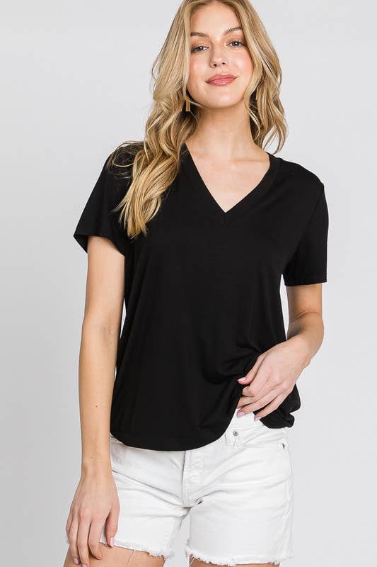 This trendy top is made of a blend of 92% Rayon Modal and 8% Spandex, it's the perfect blend of softness and stretch. You can never have too many basics Get ready to crush the basics game with this ultra-comfy top! Plus, the V-neck and flattering 24-inch length make it stylishly simple. (Just be aware, the color might look different on your screen - technology is wild, y'all!)