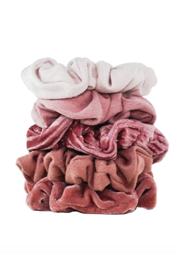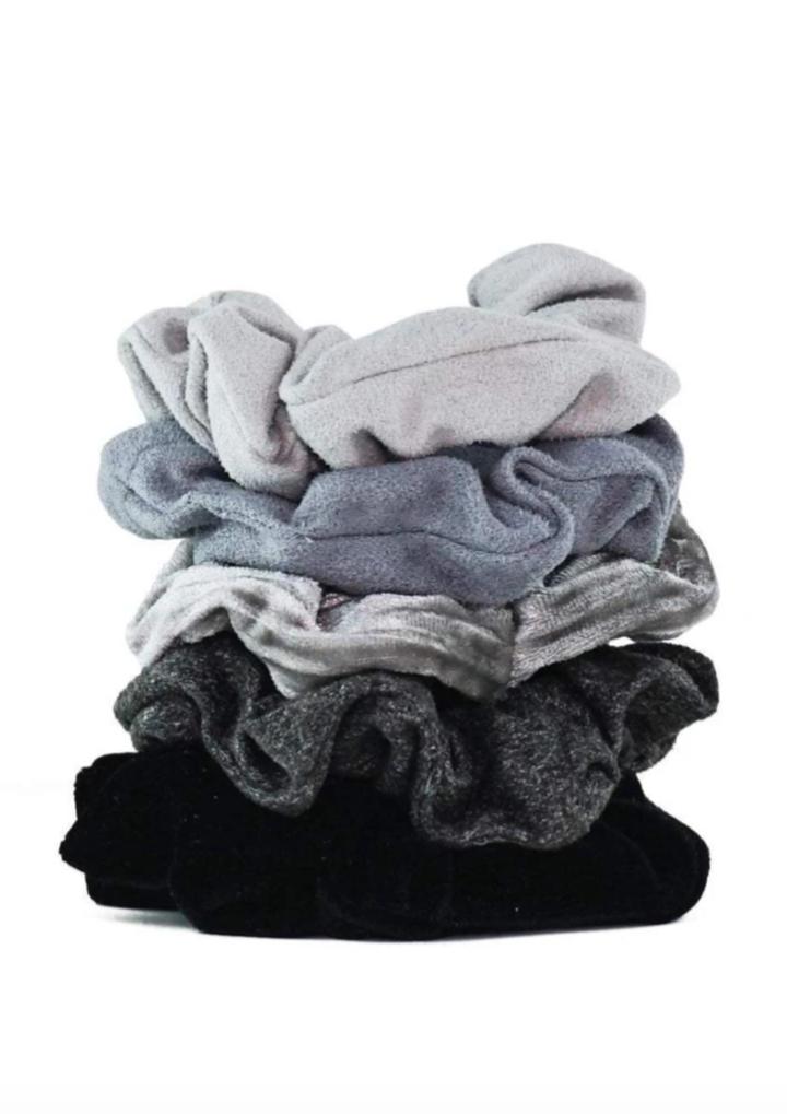 -Velvet Scrunchies card features 5 velvet hair scrunchies in assorted black/gray tones